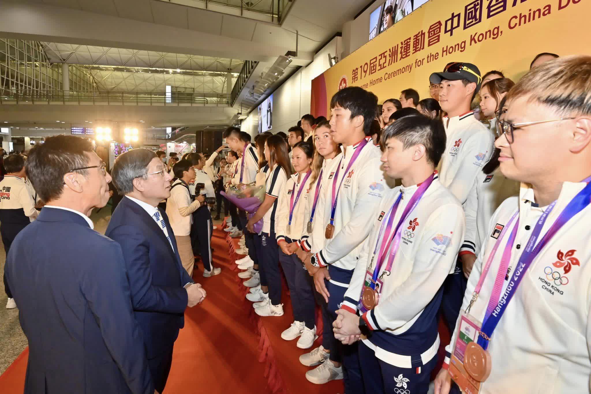 杭州亞運(yùn)會(huì)昨日(9日)閉幕,中國(guó)香港代表團(tuán)今屆合共取得8金、16銀和29銅共53面獎(jiǎng)牌的歷史佳績(jī)。港隊(duì)部分成員今晚(9日)回港,特區(qū)政府在香港國(guó)際機(jī)場(chǎng)舉行歡迎儀式,迎接代表團(tuán)凱旋。