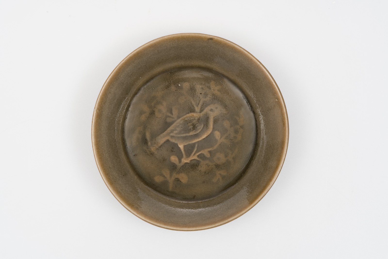 青釉印花喜鵲登枝紋盤,北宋(晚期)至金代。