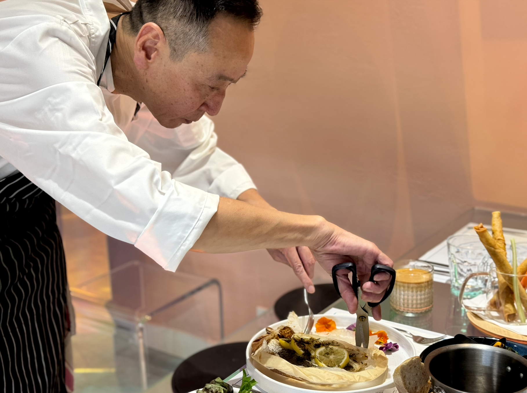 大廚Alex正在處理傳統(tǒng)法式紙包焗盲鰽柳的最後一道工序。