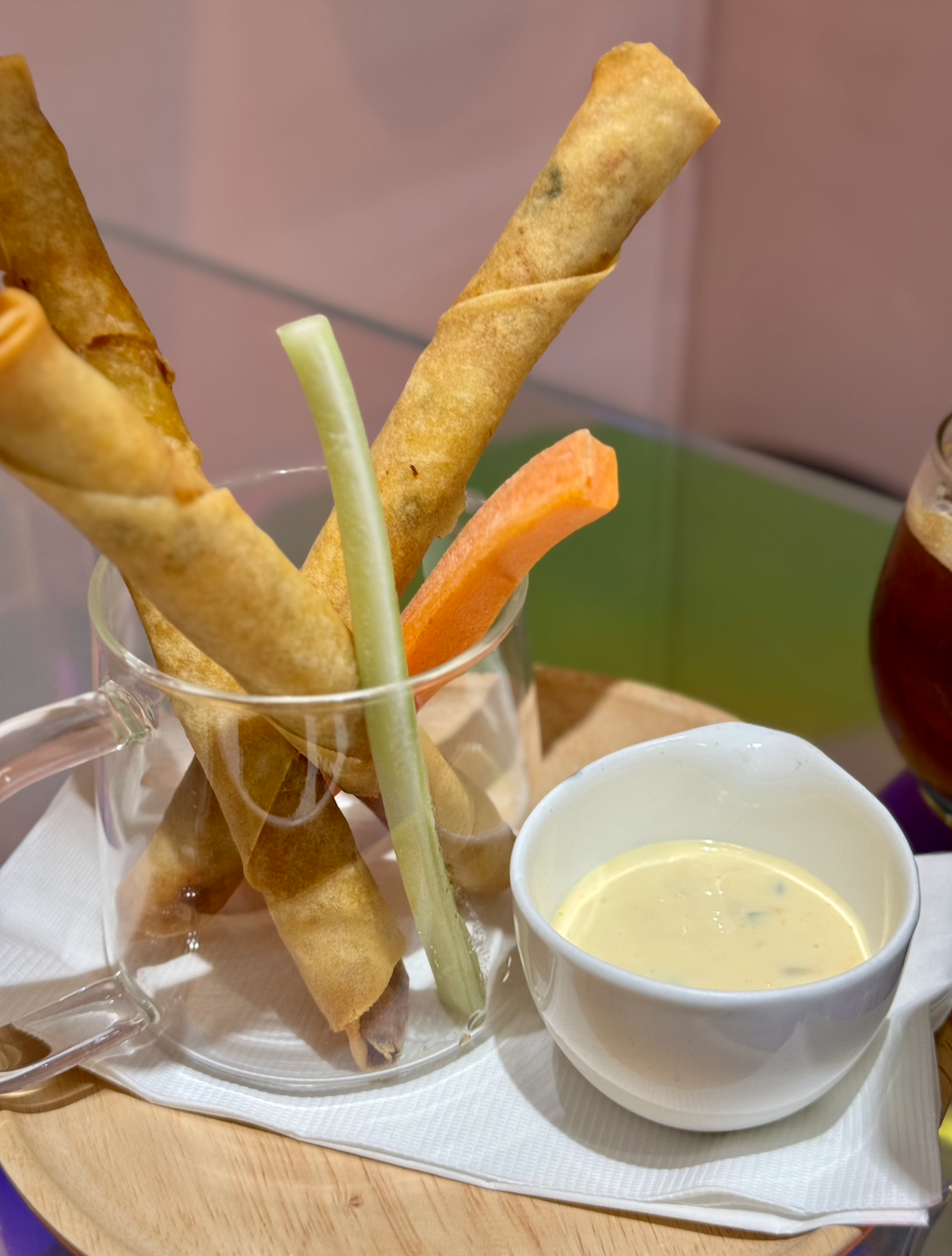 蟹肉春卷搭配熱情果蛋黃醬,蟹肉香濃而不膩,HK$98。