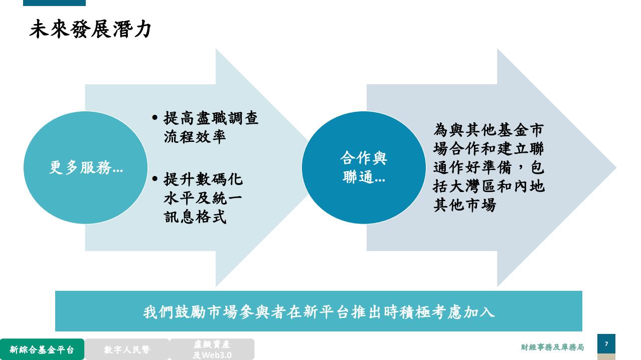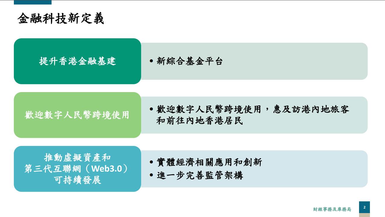 財(cái)經(jīng)事務(wù)及庫務(wù)局(財(cái)庫局)今日(2日)在香港金融科技周2023上,公布一系列促進(jìn)香港金融科技發(fā)展的主要措施,旨在聯(lián)動(dòng)金融科技惠及實(shí)體經(jīng)濟(jì),包括推出新的綜合基金平臺(tái);歡迎數(shù)字人民幣跨境使用,便利訪港內(nèi)地旅客和前往內(nèi)地的香港居民;以及促進(jìn)虛擬資產(chǎn)和Web3.0領(lǐng)域與實(shí)體經(jīng)濟(jì)相關(guān)的應(yīng)用和創(chuàng)新,並進(jìn)一步完善監(jiān)管架構(gòu)。