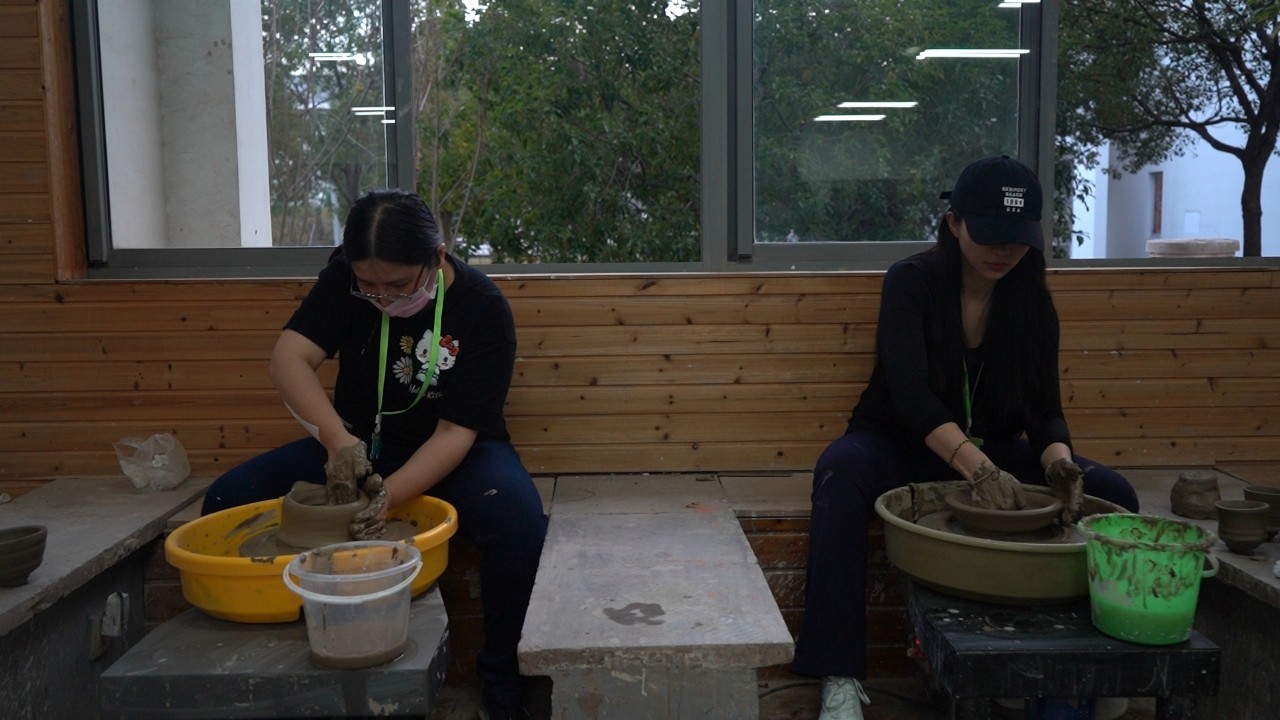 拉坯,是傳統(tǒng)瓷器技藝的基礎(chǔ)步驟,即便是有美術(shù)功底的學(xué)生,也需要長時間練習(xí),才能順利「出師」。在蘇州工藝美術(shù)職業(yè)技術(shù)學(xué)院手工藝術(shù)學(xué)院陶藝教室,青年學(xué)生們向陶藝?yán)蠋燑S雄英現(xiàn)場學(xué)藝,感受制瓷工藝的魅力。在黃老師和學(xué)院同學(xué)的幫助下,學(xué)生們用力將泥料揉成團,放在拉坯機上,通過轉(zhuǎn)動的圓盤,輕撚慢攏,將泥料一一塑型。伴隨著兩地青年的歡聲笑語,一件件帶著手心溫度、不同樣態(tài)的作品逐漸成型。