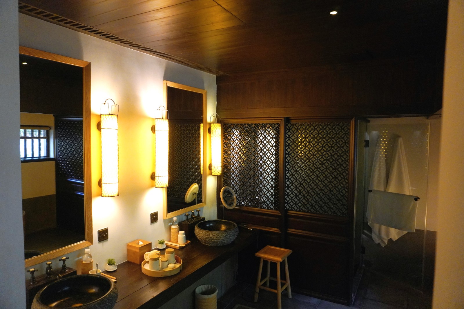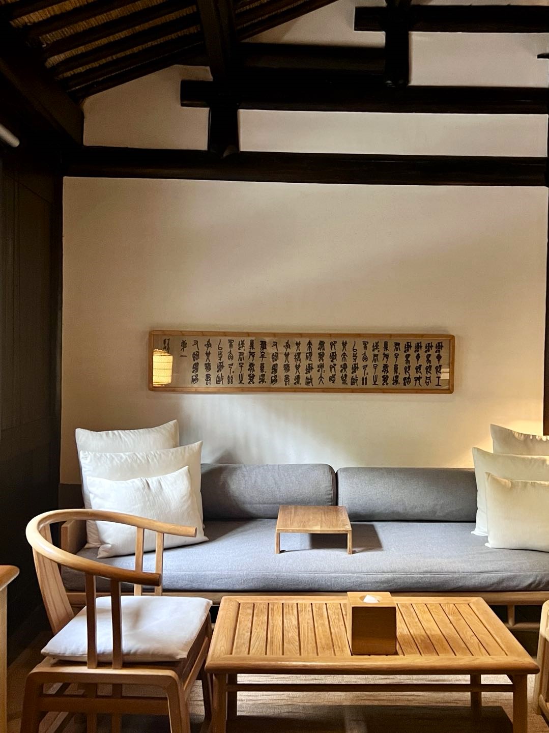 酒店位於山谷之間,順著草木簇擁的小路便能走到燈光昏暗的大堂,恍如從都市穿越了數(shù)百年時光。酒店前身是名為「法雲(yún)村」的古村落,村子後來改建成一間間客房。法雲(yún)村最早的文字記載在唐代,有上千年歷史,作為龍井之鄉(xiāng),茶農(nóng)世代棲居於此。酒店設(shè)計概念為「18世紀的中國村落」,有逾40間客房、套房,每間布局不盡相同,均以中式裝潢為主,如融匯古今的木紋家具、傳統(tǒng)雕花的屏風、放在不同位置的油紙燈籠燈、木質(zhì)推窗、掛於牆上的書法作品等,構(gòu)成幽靜的空間。酒店房間散落在600米長的「法雲(yún)徑」兩旁,以「滄月」、「汲清」、「鑄璞」等清雅名字命名。房內(nèi)並無電視機,僅有一部CD播放機。夜裏,筆者聽著佛經(jīng),抄寫酒店提供的金剛經(jīng),慢慢專注當下,讓人心境平靜踏實。