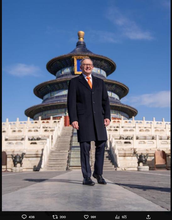 北京時間6日,正在中國進行訪問的澳大利亞總理安東尼·阿爾巴尼斯在社交媒體上發(fā)布了自己參觀天壇的照片,並發(fā)文談澳中關(guān)係。