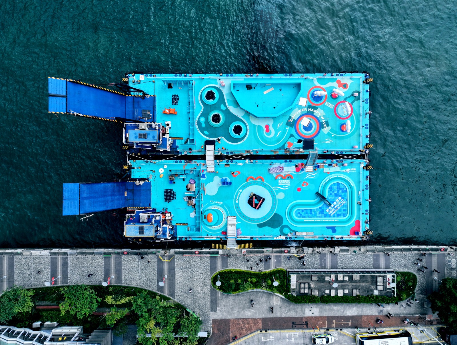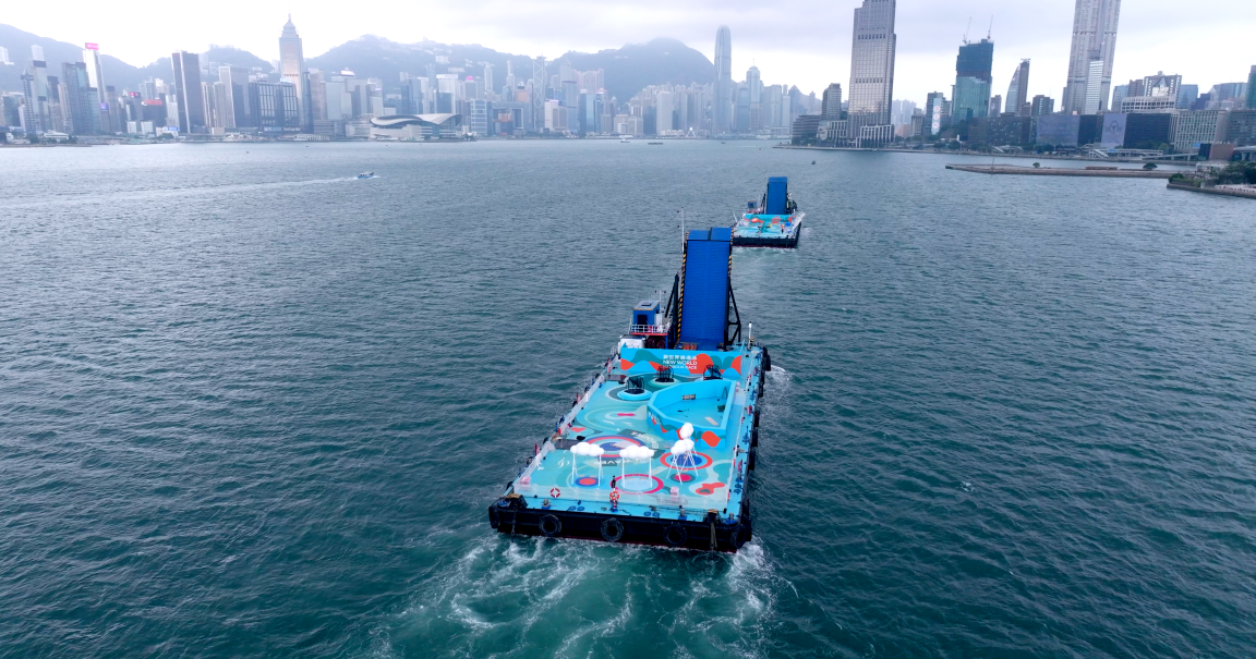 該海上遊樂場於大型船隻上搭建,兩周前已開始在柴灣公眾貨物裝卸區(qū)組裝,今日(9日)上午駛往尖沙咀海濱花園作最後準備。船上6項遊樂設施動靜皆宜,均以新世界維港泳、維港景色及快樂為設計概念,包括新世界維港泳巨型浮波、「海岸滾輪」「快樂#PowerUp『抱抱』池」「相躍彈床」「無邊鞦韆」及「巨型飛天泳手」。