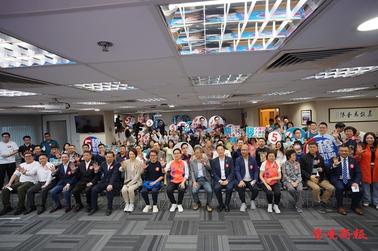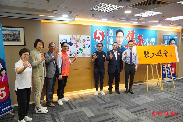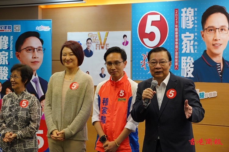 曾鈺成、譚耀宗及李慧瓊等為參選人穆家駿站臺打氣。記者 馮俊文攝