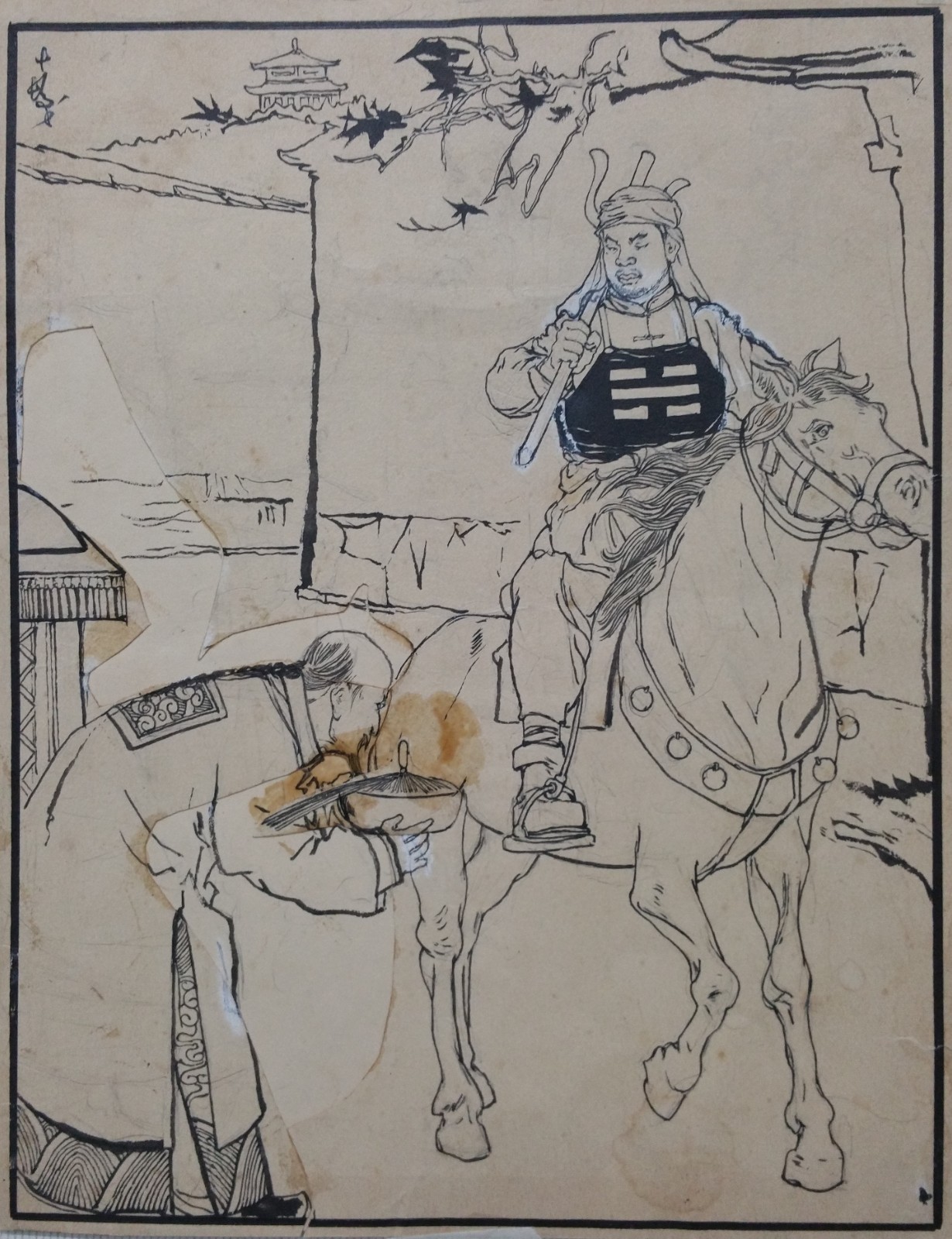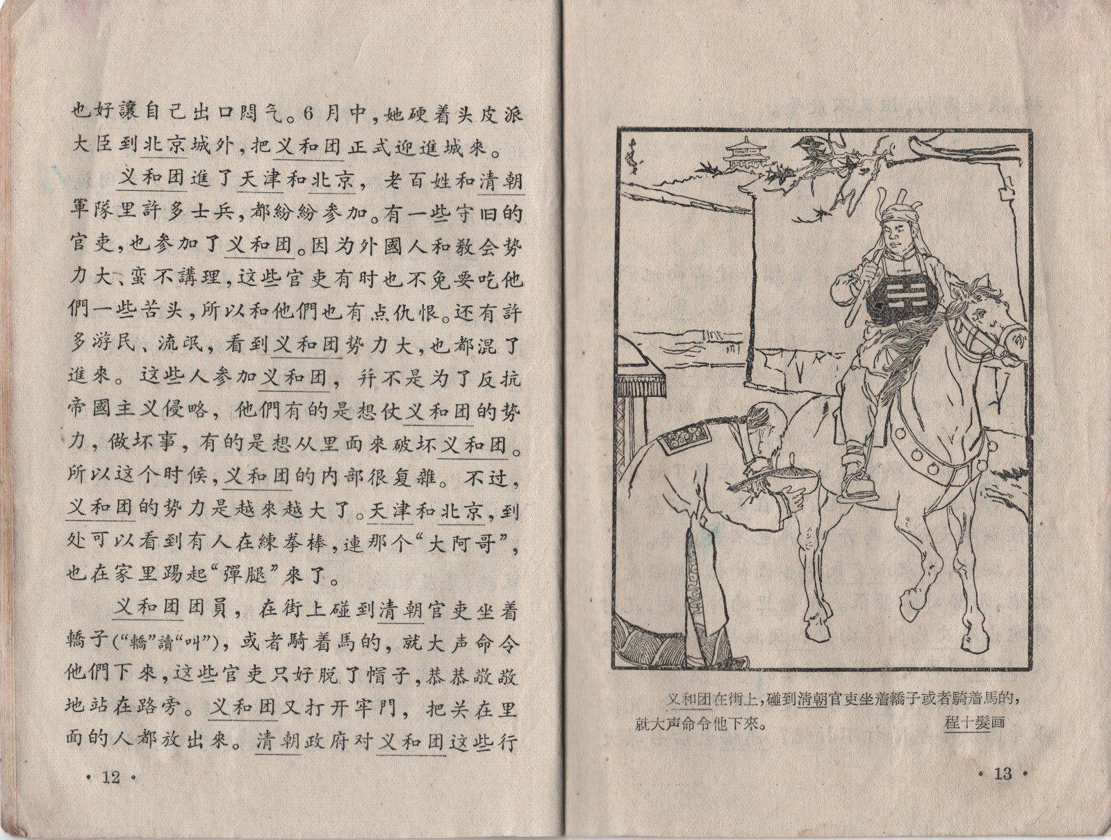《義和團》是1956年上海人民出版社出版的學文化補充讀物《義和團》的插圖之一,描述義和團成員在北京街上碰到清朝官吏騎在馬上,就大聲命令他下來。這官吏下馬後,還脫下帽子,恭恭敬敬站在旁邊。畫面豐富飽滿而層次分明,觀者隨著已經(jīng)騎上馬、趾高氣揚的義和團成員的眼神視線,可以看到剛下馬的官員捧著帽子彎腰低頭的恭順模樣。人物的眼神、手勢、身體姿態(tài),活現(xiàn)了其心理狀態(tài),躍然紙上,呼之欲出。