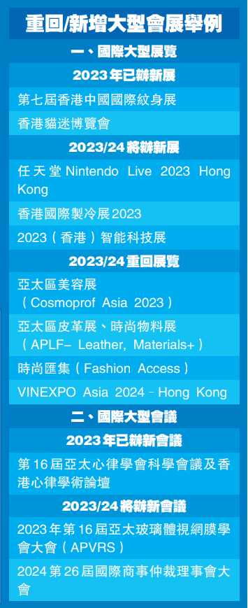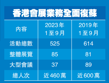 梅李玉霞最開(kāi)心的是,所有於疫前定期在會(huì)展舉辦的大型商貿(mào)展覽,已相繼在今年或明年重返香港,「經(jīng)常性商貿(mào)展覽數(shù)目將回復(fù)至每年70個(gè),重返疫前水平」。同時(shí),今年1至9月,會(huì)展所有活動(dòng)種類(lèi)總數(shù)已回復(fù)2019年的85%,總?cè)舜我嗷貜?fù)近80%,「我們好有信心明年初可100%全面復(fù)?!埂?/p>