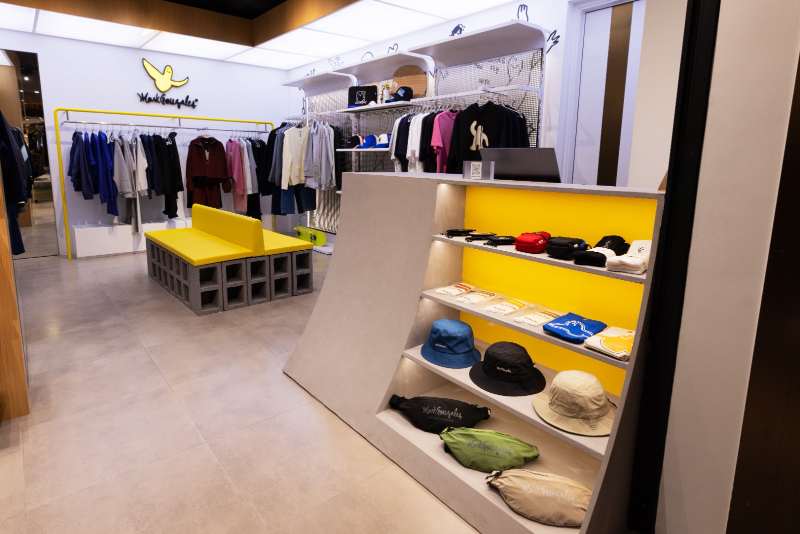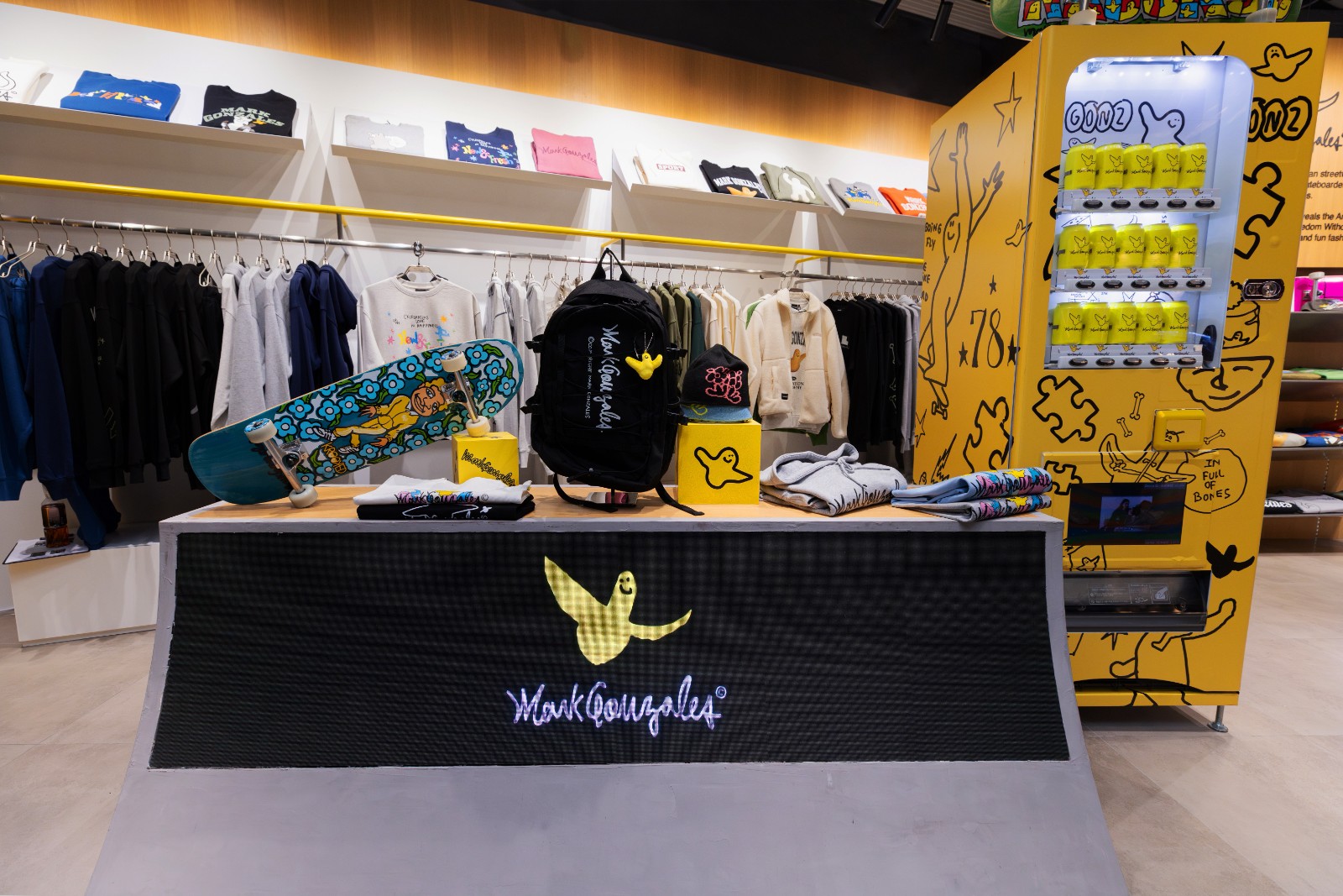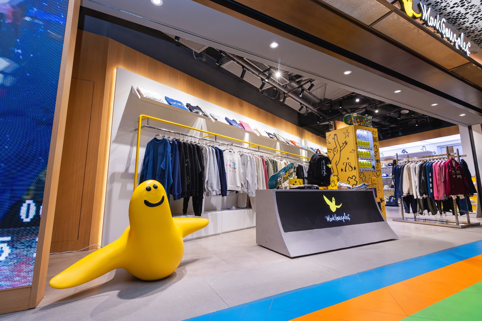 Mark Gonzales自90年代開始,把創(chuàng)意延伸至街頭時尚領域,與不少街頭品牌合作,他同時擁有傳奇滑板高手及當代藝術家等多重身份。品牌具標誌性的ANGEL天使圖案,是他塗鴉作品中一個簽名式標記,大阪、倫敦專門店的巨型ANGEL雕塑粉飾店舖空間也成潮人朝聖地標。香港專門店亦繼承了此裝潢美學,甫踏入店面就能看見立體雕塑ANGEL,並布置以滑板場斜臺 (Ramp) 為概念的展示櫃、跳臺座椅及欄桿掛衣架,配合襯托壁面的塗鴉藝術,玩味呈現(xiàn)街頭文化。