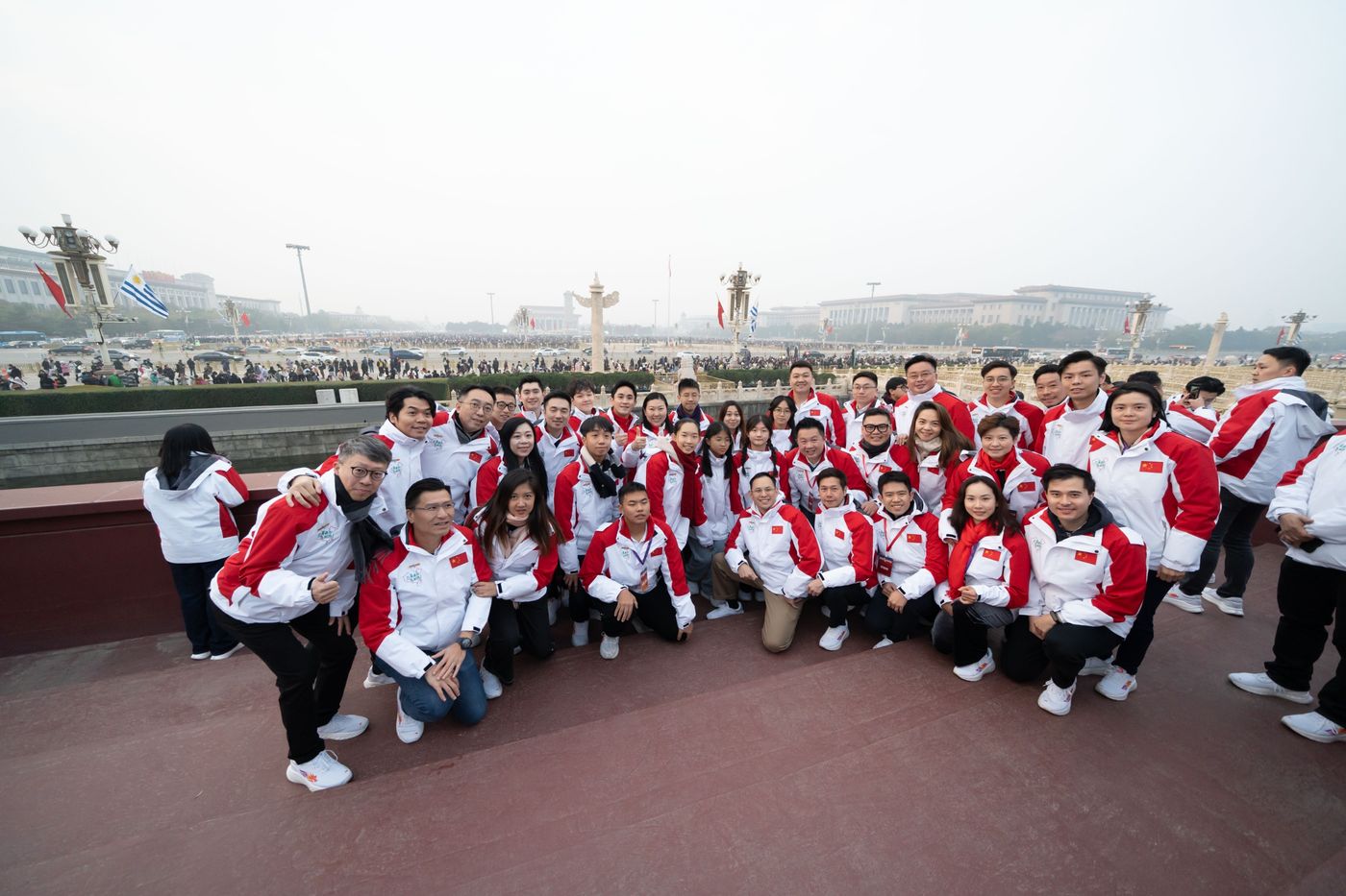 「港澳青年看祖國」香港青年訪京團(tuán)22日早晨出席升旗儀式後於天安門城樓合影。