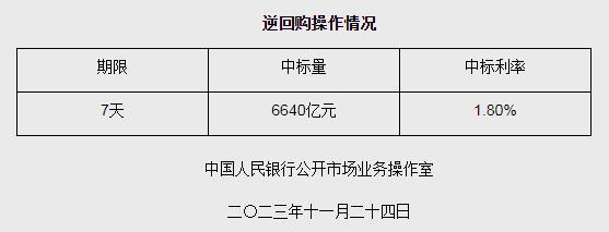 據(jù)央行網(wǎng)站消息,為維護月末流動性平穩(wěn),2023年11月24日人民銀行以利率招標方式開展了6640億元逆回購操作,中標利率1.80%,期限為7天。具體情況如下: