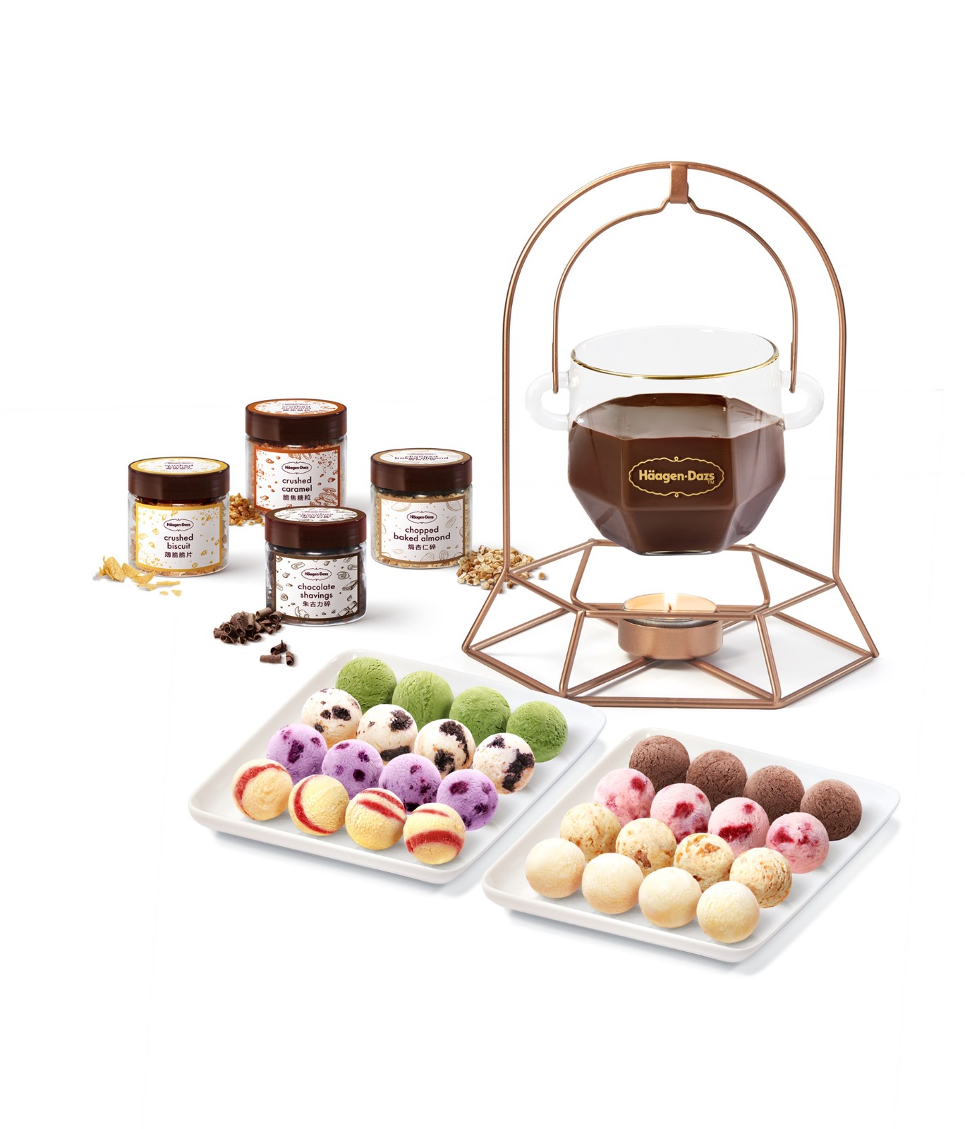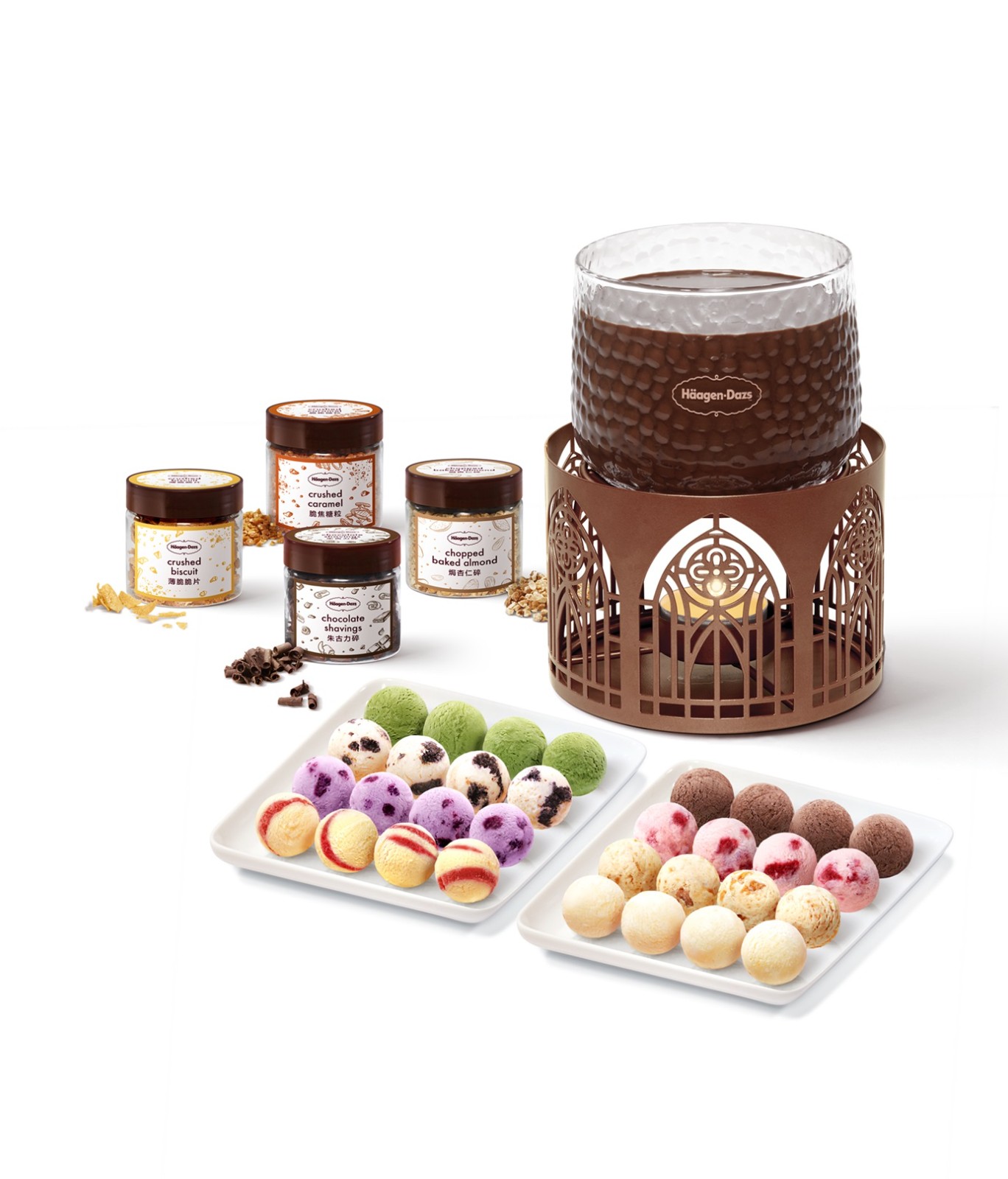 新推出的「The Party Duo」派對脆軟雙享外賣雪糕火鍋,將香濃朱古力醬、迷你雪糕球和四款全新香脆點拼配料組合,可充分感受到冰熱交融、脆軟交織的豐富口感。迷你雪糕球蘸上朱古力醬,再灑上各種美味配料,如朱古力碎、焗杏仁碎、薄脆脆片和脆焦糖粒,增添層次感和口感。