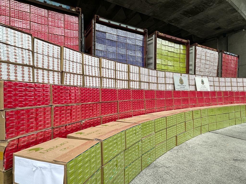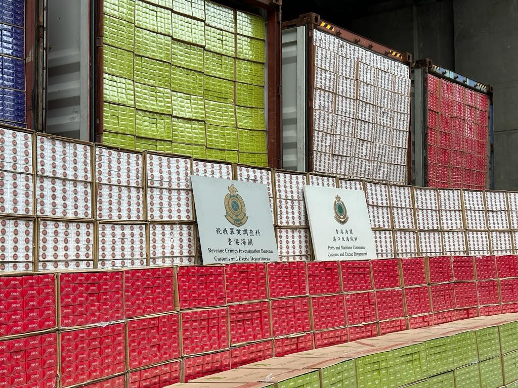海關(guān)稅收罪案調(diào)查科稅收調(diào)查第一組高級調(diào)查主任林威杰今日(29日)表示,人員15日在葵涌貨櫃碼頭鎖定一個由臺灣抵港、報稱載有塑膠板的40呎貨櫃,經(jīng)檢查後在貨櫃內(nèi)搜出930萬支私煙。在同日在屯門內(nèi)河碼頭一個由廣州抵港、報稱載有花盤和燈飾的40呎貨櫃中再搜出160萬支私煙。