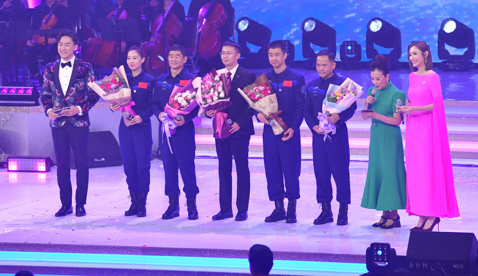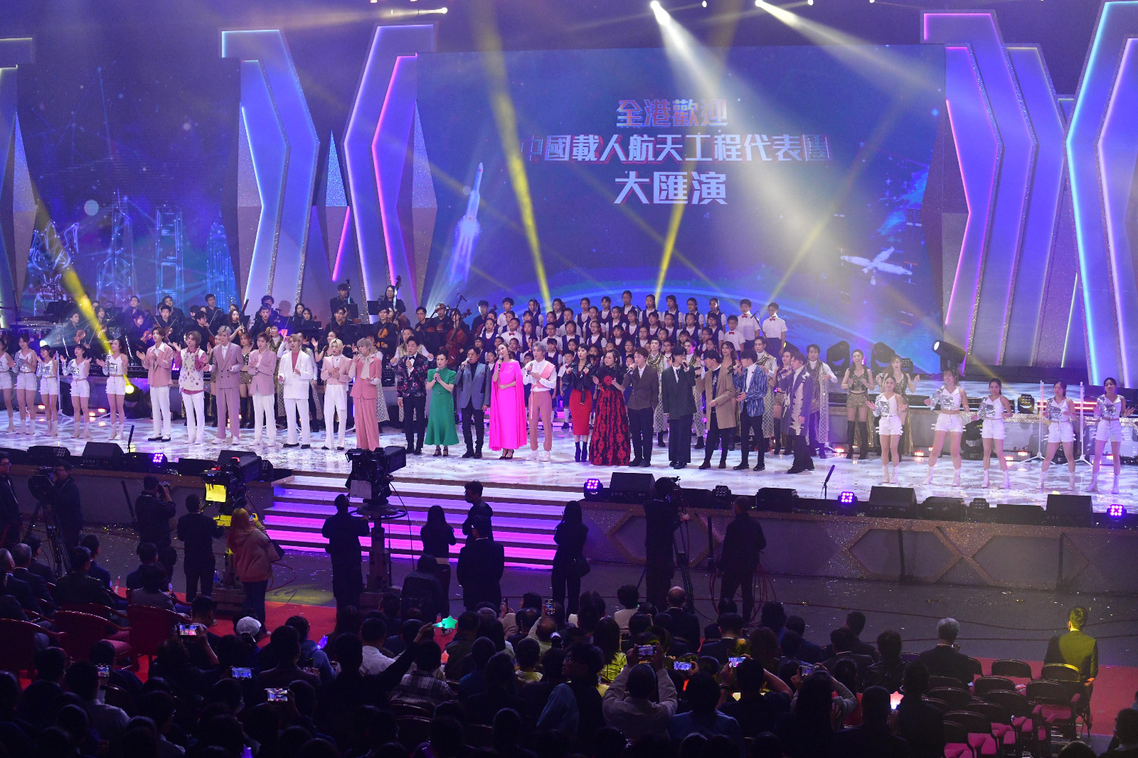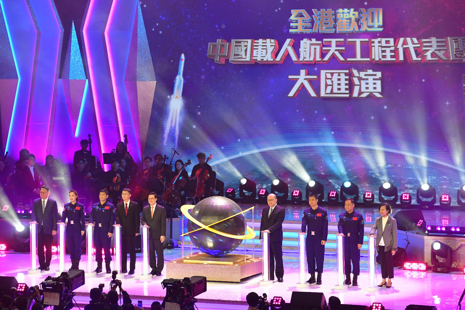 中國(guó)載人航天工程代表團(tuán)訪港4天,今日(29日)展開(kāi)第二天行程,當(dāng)晚他們出席了在香港體育館舉行的「全港歡迎中國(guó)載人航天工程代表團(tuán)大匯演」,約5000觀眾欣賞了1小時(shí)半的歌舞大匯演,場(chǎng)面氣氛熱烈,許多中學(xué)生穿著校服結(jié)與同學(xué)一起前來(lái),也有家長(zhǎng)帶著小朋友而來(lái)。代表團(tuán)團(tuán)長(zhǎng)林西強(qiáng)、航天員劉伯明、王亞平、陳冬及張陸,在行政長(zhǎng)官李家超、中聯(lián)辦主任鄭雁雄等陪同下進(jìn)場(chǎng),全場(chǎng)觀眾揮動(dòng)舞螢光棒歡呼。