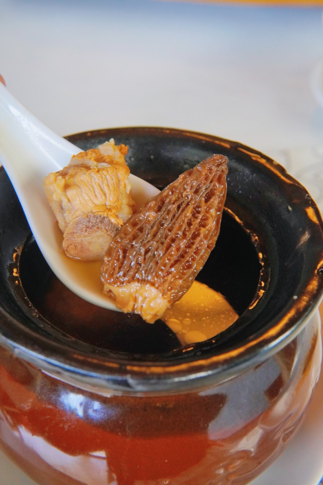 瓦罐煨羊肚菌豬骨湯,肉香清甜,羊肚菌入口脆嫩。