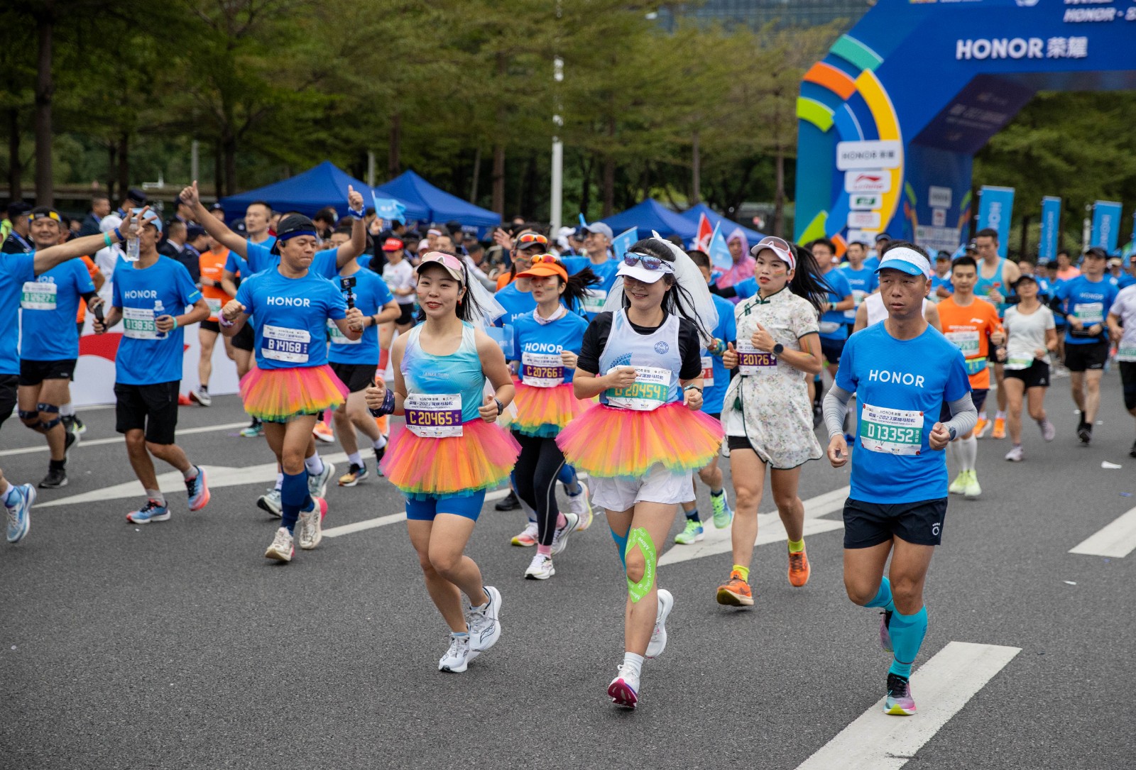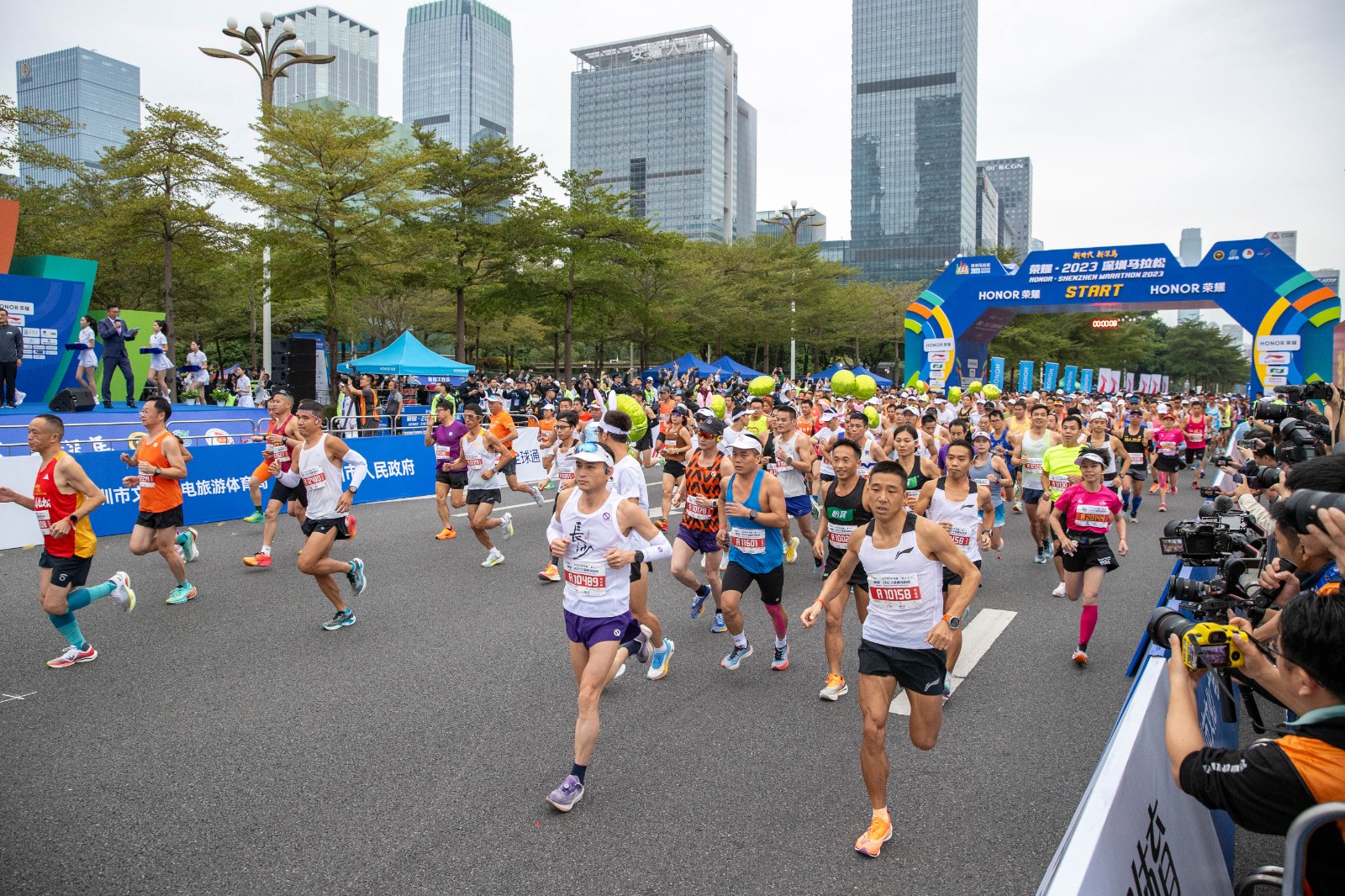 12月3日一早,隨著發(fā)令槍響,2萬(wàn)名跑者從市民中心出發(fā),踏著朝陽(yáng)金色的光暈奔向?qū)毎矃^(qū)海濱公園——榮耀·2023深圳馬拉松激情開(kāi)跑,這一年一度馬拉松愛(ài)好者的嘉年華再次點(diǎn)燃了深圳市民以及世界各地跑者的熱情。他們?cè)谏钅洗蟮郎媳寂堋⒃谏钲跒彻珗@裏穿梭、在前海石公園前奔馳、在「山海連城」的美景之間,跑友們?yōu)樾闹忻篮玫奈磥?lái)全速前進(jìn)。