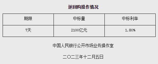 據(jù)央行網(wǎng)站消息,為維護(hù)銀行體系流動(dòng)性合理充裕,2023年12月5日人民銀行以利率招標(biāo)方式開(kāi)展了2100億元逆回購(gòu)操作,中標(biāo)利率1.80%,期限為7天。具體情況如下:
