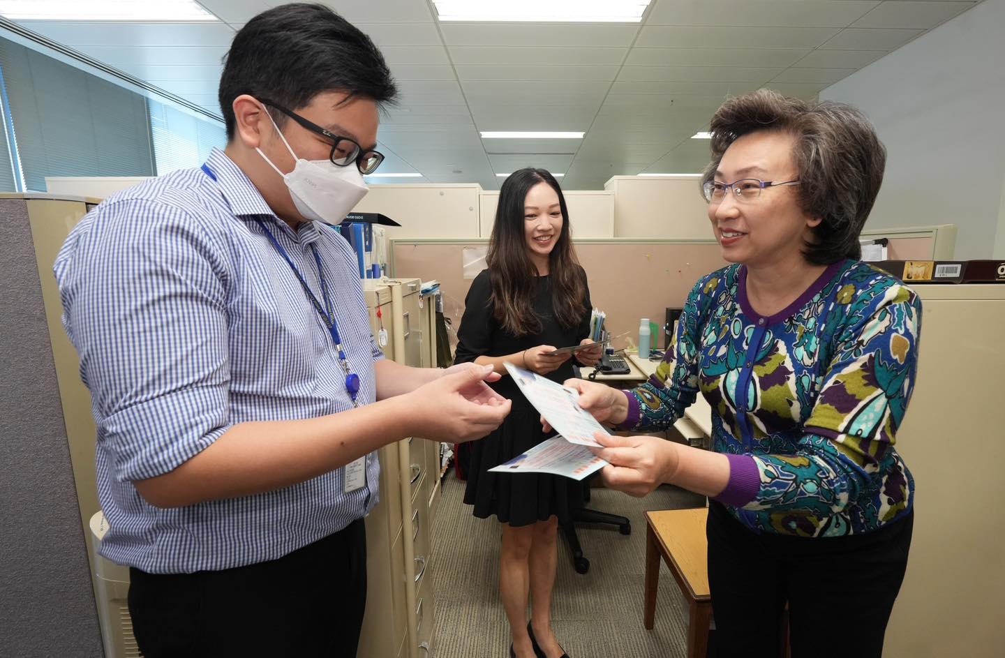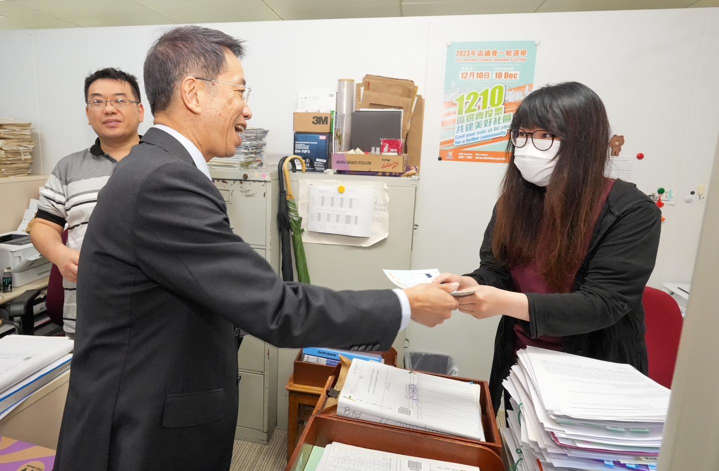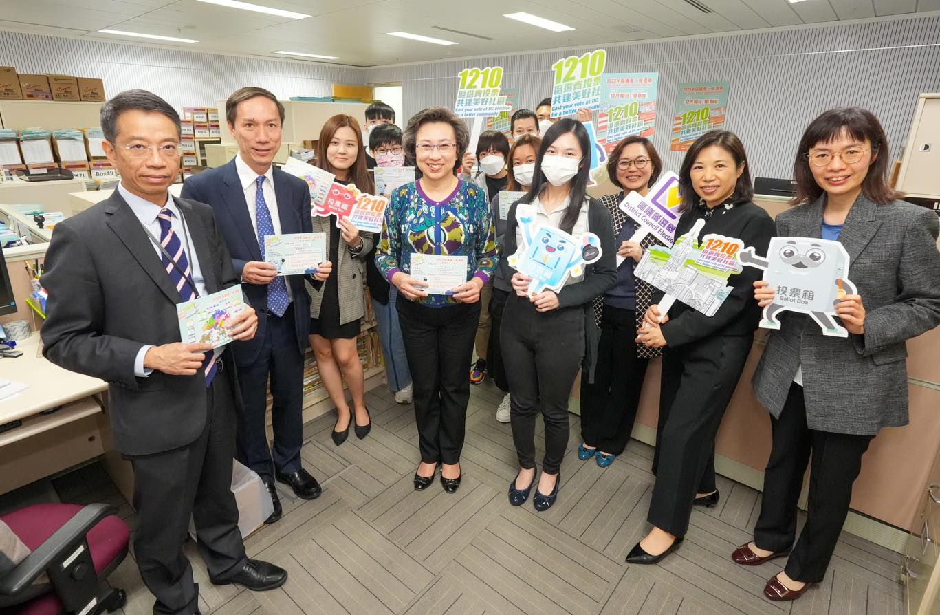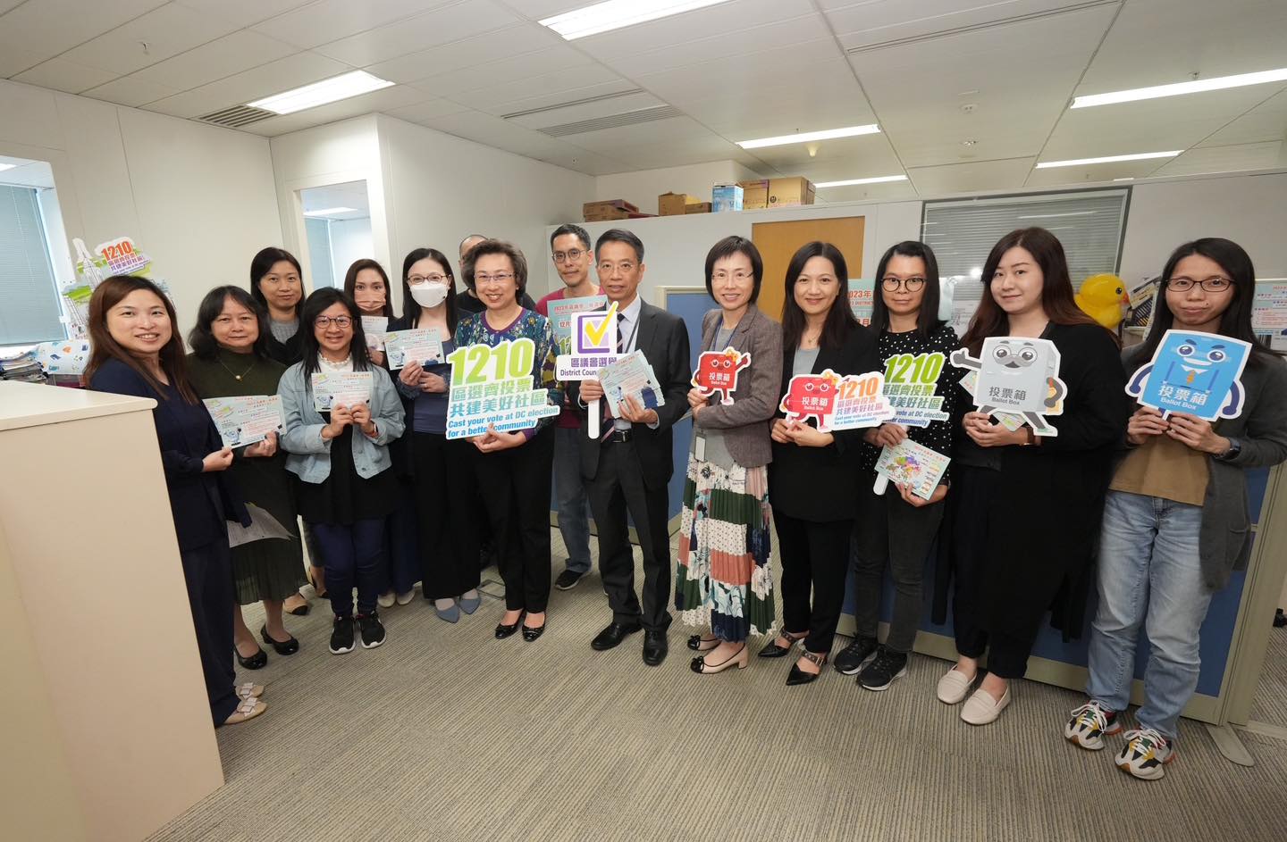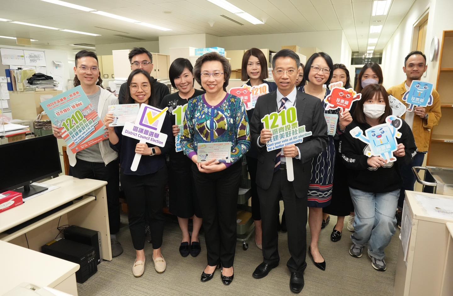 區(qū)議會選舉周日(10日)投票,公務(wù)員事務(wù)局局長楊何蓓茵聯(lián)同常任秘書長梁卓文,3名副秘書長張馮泳萍、陳慧欣、劉思敏,及一般職系處長陳信禧,今日(6日)到公務(wù)員事務(wù)局位於政府總部的4個辦公室樓層「洗樓」,派發(fā)1210區(qū)選單張,提醒公務(wù)員當(dāng)日投票需要注意的事項和程序及踴躍投票,並呼籲公務(wù)員於12月10日撐區(qū)選、齊投票。