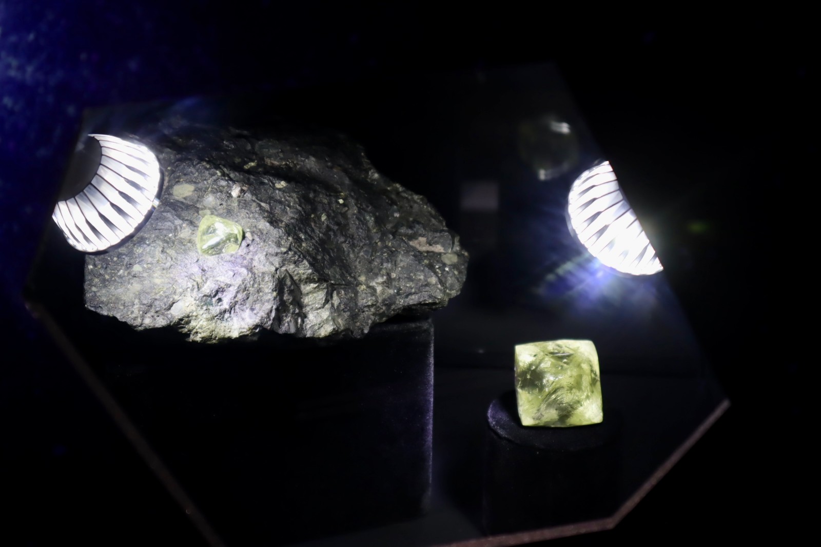 重達(dá) 616 克拉的鑽石原石及一顆鑲嵌了 60 克拉鑽石原石的金伯利巖。