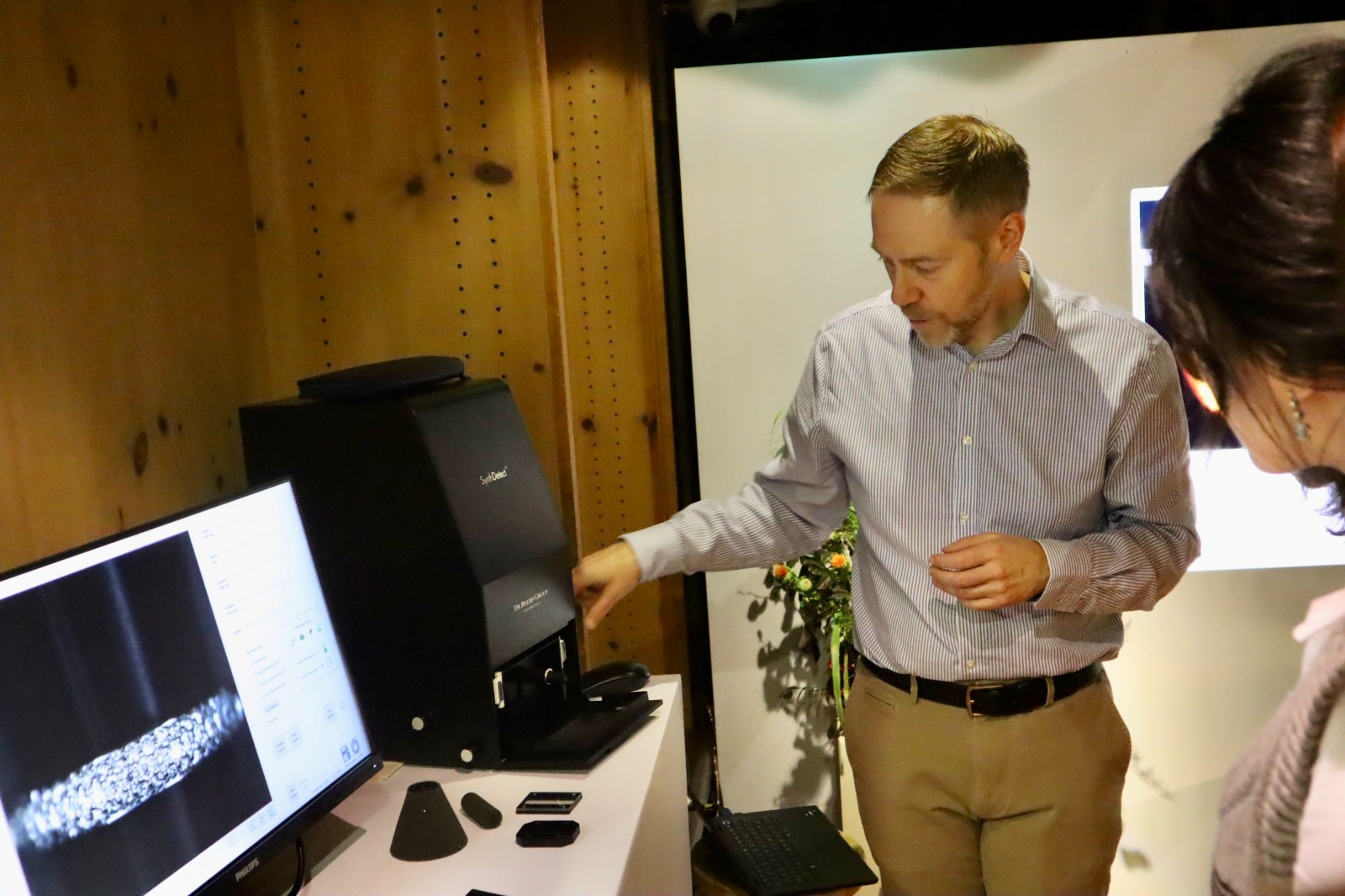 鑽石專家Nick Davies博士現(xiàn)場以品牌開發(fā)的 Synth Detect 和 Diamond Sure 鑽石檢測儀,演示了如何檢測實驗室培育的鑽石。