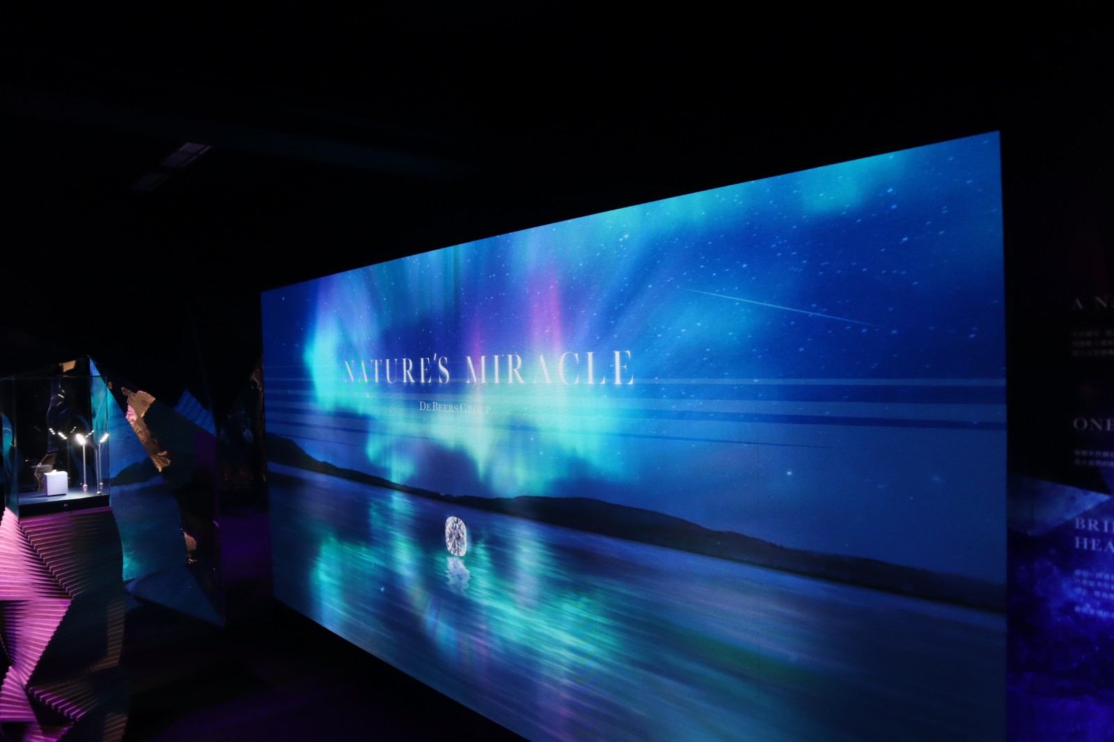 三樓展覽空間內(nèi),光影交織的效果營造出的光影氛圍,將令參觀者猶如置身於浩渺宇宙中,享受一場沉浸式的藝術(shù)體驗。DJ 黃志淳和天然美鑽大使文詠珊分別以粵語和普通話旁述天然鑽石的故事。參觀者可通過聲音與影像的交融,領(lǐng)略天然鑽石的魅力。