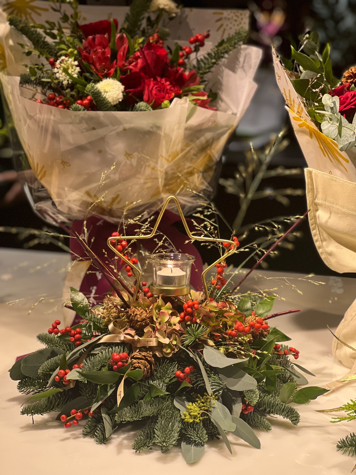 FLEURISTE推出多款花藝設計,有適合作掛飾的聖誕花環(huán),亦有裝飾餐桌的桌花、座枱鮮花及蠟燭臺,有為小居室而設的迷你聖誕樹,及捧花、鮮花禮盒等。今年的聖誕花藝加入有著金漆外層的枝葉,令整體設計華麗奪目;選擇紅色朱頂蘭作重點花材,花瓣像喇叭,顏色悅目?;ㄋ噹煂3虖臍W洲各地搜羅各種器皿,款式獨特。此外,分店亦設花環(huán)製作工作坊,專業(yè)花藝師帶領大家以應節(jié)花材製作專屬的花環(huán),工作坊作為聖誕籌備活動,提升佳節(jié)儀式感。
