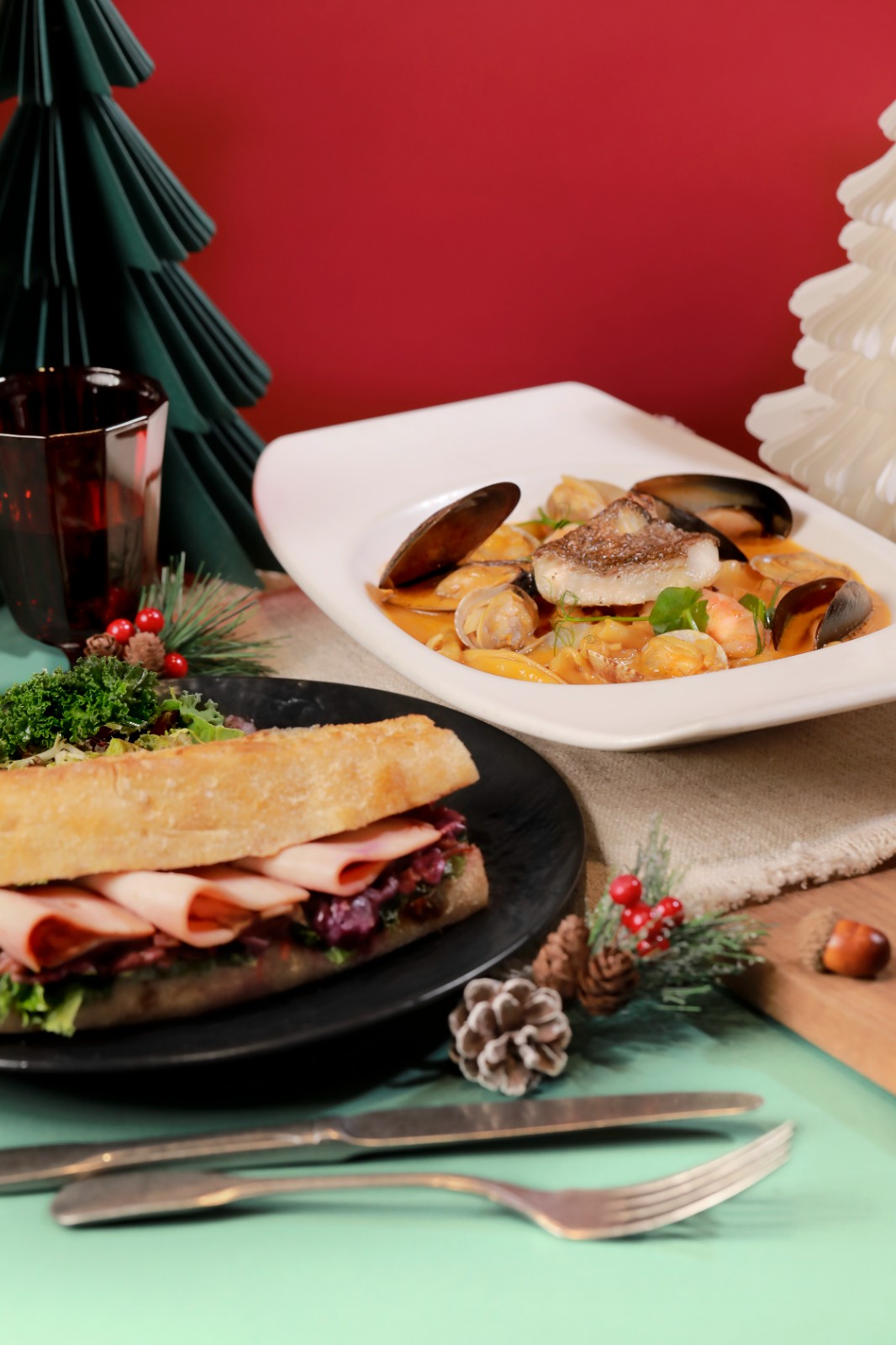 CAFé為佳節(jié)設計限定應節(jié)菜式,包括清新開胃的前菜風乾火腿、白桃、紅菜頭沙律伴黑醋汁,傳統(tǒng)風味的主食法式海鮮馬賽魚湯麻花捲意粉及煙三文魚忌廉黑松露芝士雲(yún)吞,及富聖誕節(jié)氛圍的輕食煙火雞片法包。特飲方面,加入大量聖誕元素,包括兩款鮮奶咖啡,分別以薑餅糖漿及爆谷營造獨特的風味?;烊牒谔堑奶貪庵旃帕τ晌概胄模嗵O果薑汁玉桂茶的溫潤滋味能消解連場大餐帶來的飽膩感。