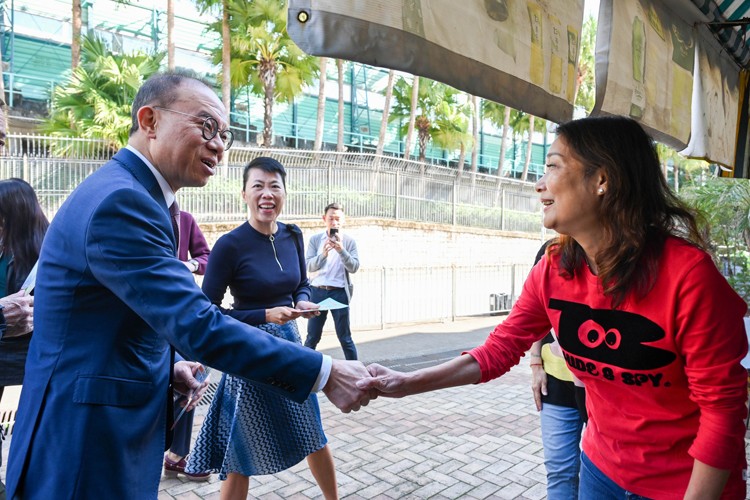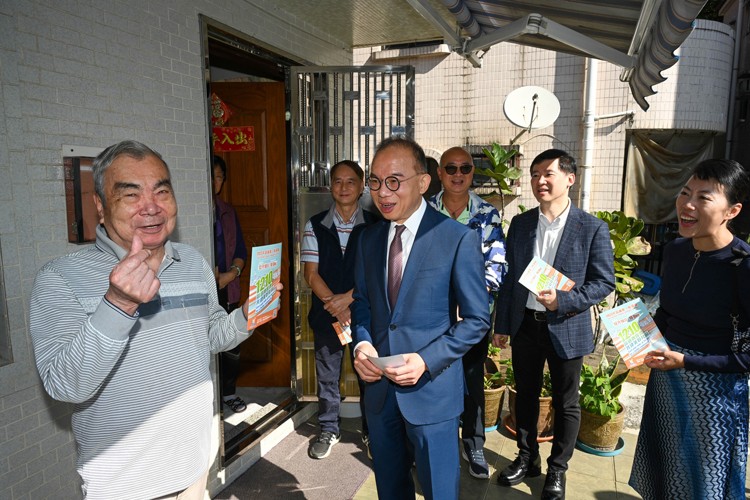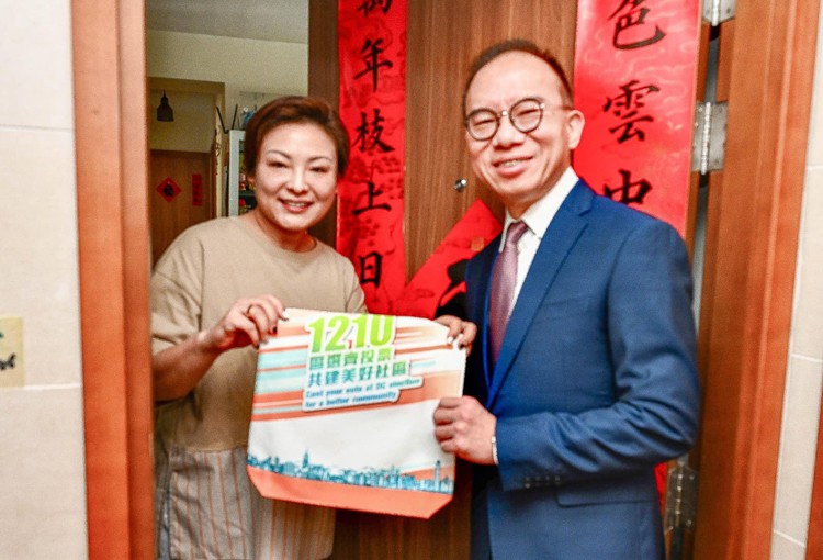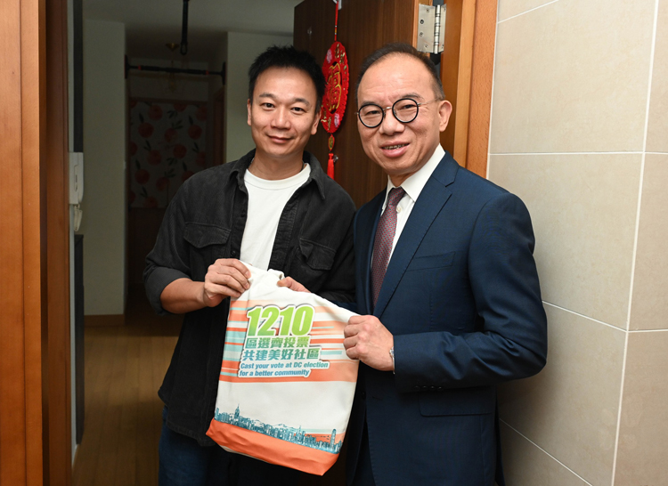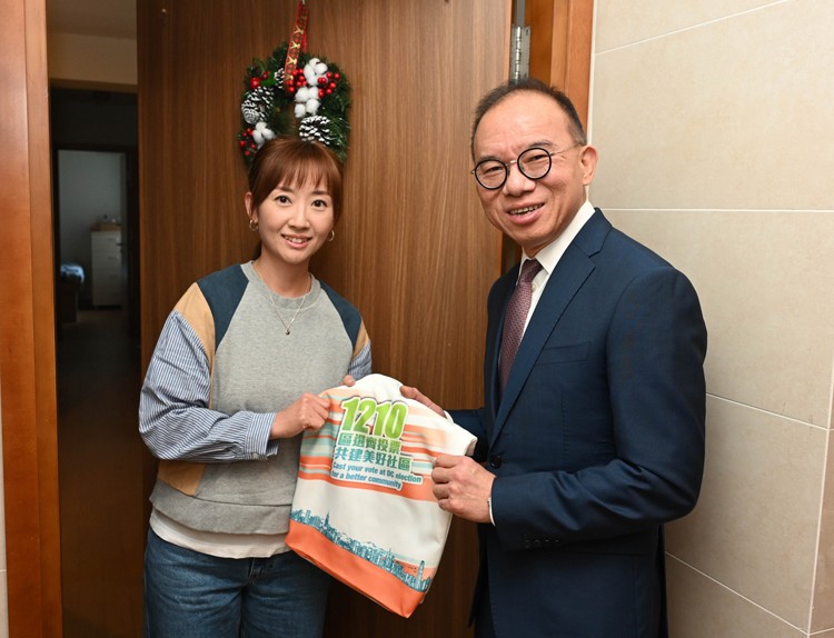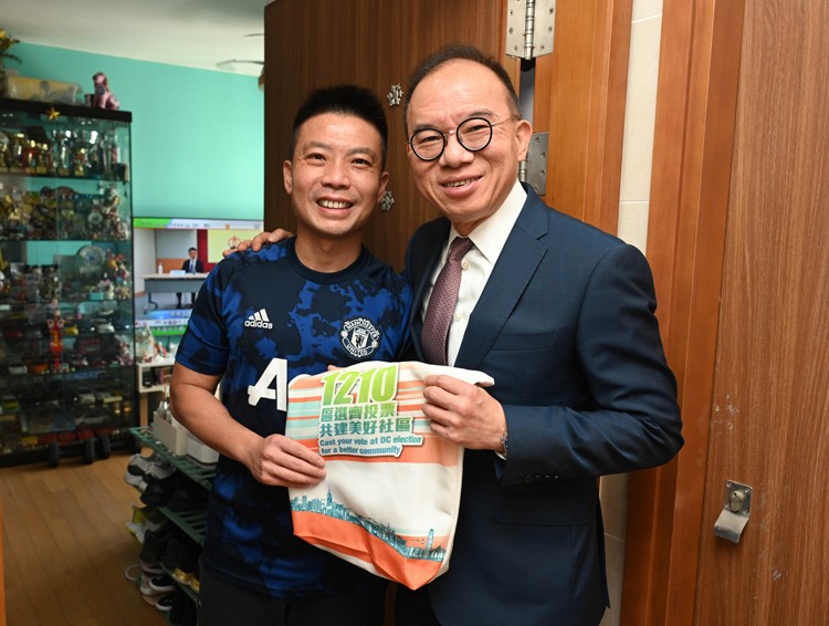 政制及內(nèi)地事務(wù)局局長(zhǎng)曾國(guó)衞和副局長(zhǎng)胡健民8日來(lái)到大埔泮涌村和觀塘紀(jì)律部隊(duì)宿舍派發(fā)宣傳單張,呼籲大家在12月10日與家人朋友一起投票。(政制及內(nèi)地事務(wù)局社交媒體圖片)