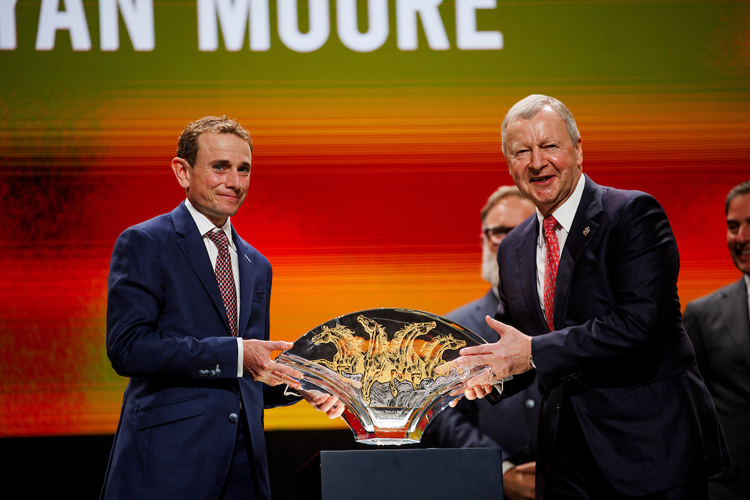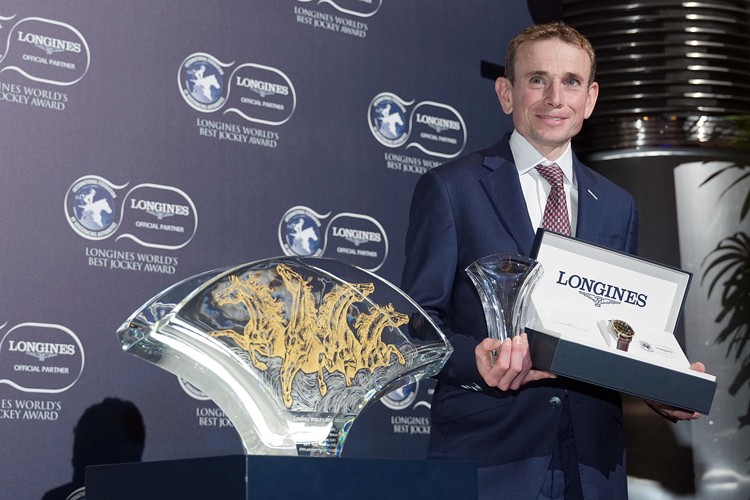 浪琴香港國(guó)際賽事歡迎晚宴舉行期間的浪琴全球最佳騎師頒獎(jiǎng)禮上,國(guó)際賽馬組織聯(lián)盟主席應(yīng)家柏頒發(fā)獎(jiǎng)座予浪琴全球最佳騎師得主莫雅。