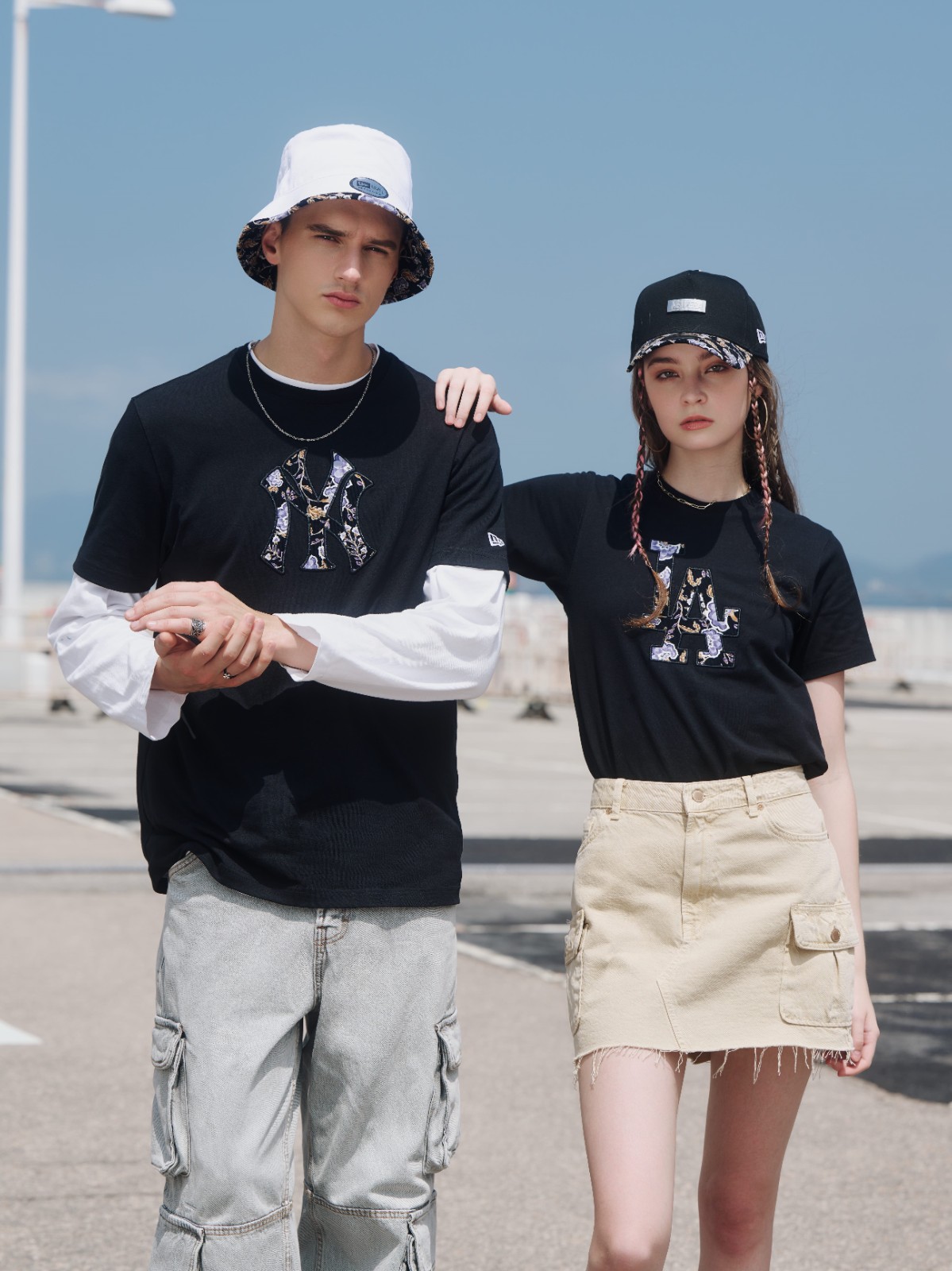 此外,新系列還推出三款服飾,包括男裝短袖T恤、女裝短袖T恤和長袖上衣,均以黑色為主。衣服前方的 NEW YORK 和 MLB 球隊隊徽,也巧妙地融入了花卉圖案。