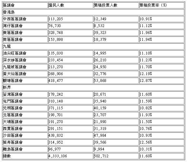 截至中午12時半,地方選區(qū)共有502712名選民已投票,投票率為11.60%;地區(qū)委員會界別則有2248名選民投票,投票率為88.78%。