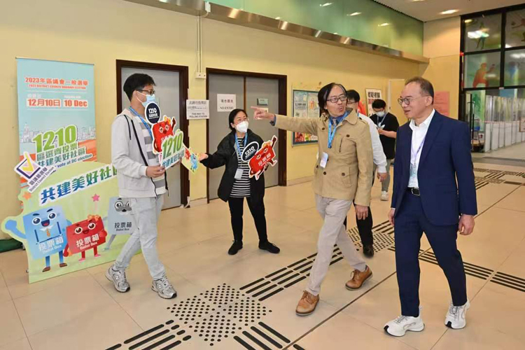 他欣悉投票站運(yùn)作暢順,亦看到不少市民投票後到投票站旁的「打卡位」拍照留念。他更即場(chǎng)調(diào)整了「打卡位」位置,令「選舉寶寶」更為顯眼。