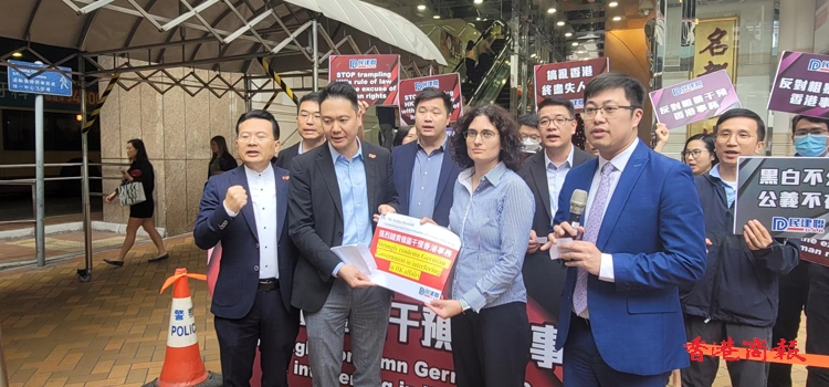 民建聯(lián)多名立法會議員周浩鼎、陳勇、顏汶羽等14日下午到金鐘統(tǒng)一中心外請願,抗議法國和德國外交部頒發(fā)所謂「人權和法治獎」予被控涉嫌干犯香港國安法罪行的鄒幸彤,德國駐港領事館派出代表接收請願信。(記者 區(qū)天海攝)