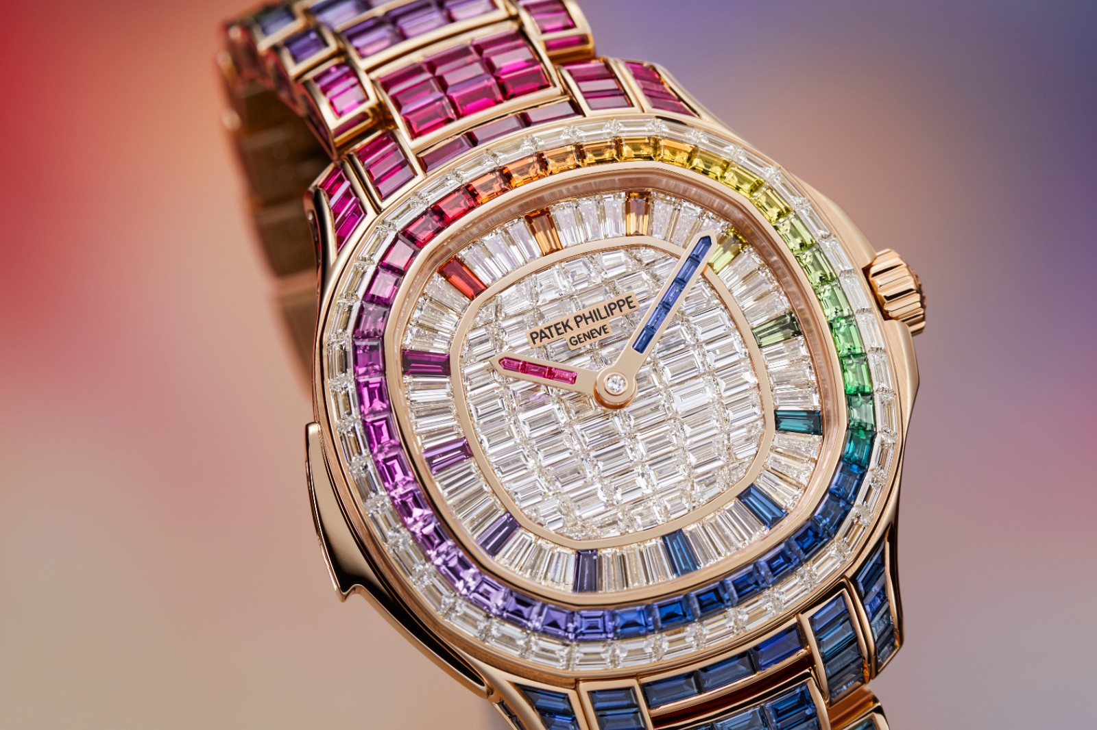 Aquanaut Luce「彩虹」高級(jí)珠寶三問(wèn)腕表是該女裝時(shí)計(jì)系列推出的首款複雜功能時(shí)計(jì)。腕表的表環(huán)形狀獨(dú)特,由兩行長(zhǎng)方形寶石潤(rùn)飾,外行由鑽石鑲嵌而成,內(nèi)行則鑲以多色藍(lán)寶石,呈現(xiàn)出彩虹色彩。表面中央鋪鑲長(zhǎng)方形鑽石,而小時(shí)顯示環(huán)則綴以圓鑽。整體表面設(shè)計(jì)中,12枚多色藍(lán)寶石小時(shí)刻度與表環(huán)的漸變色彩相呼應(yīng)。腕表底蓋下則展示了R 27自動(dòng)上弦機(jī)芯的結(jié)構(gòu)和精緻的細(xì)節(jié)。