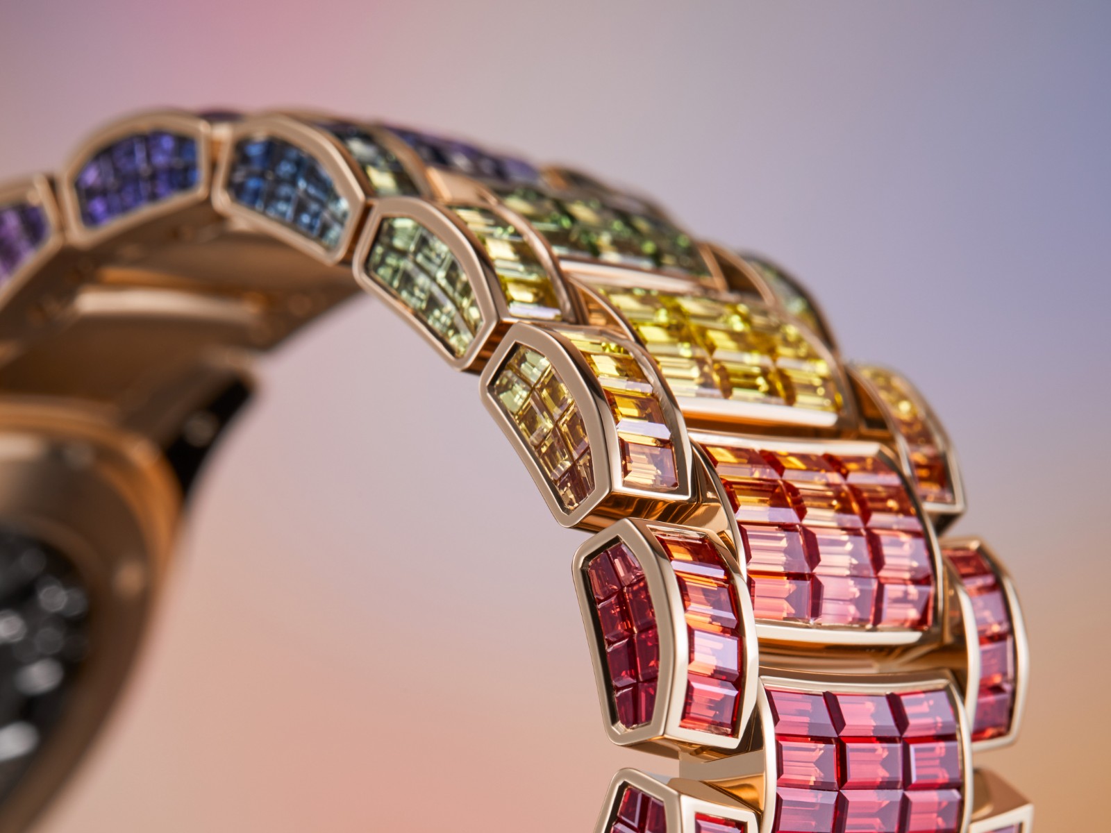 表鏈以玫瑰金製,鋪鑲長(zhǎng)方形多色藍(lán)寶石。