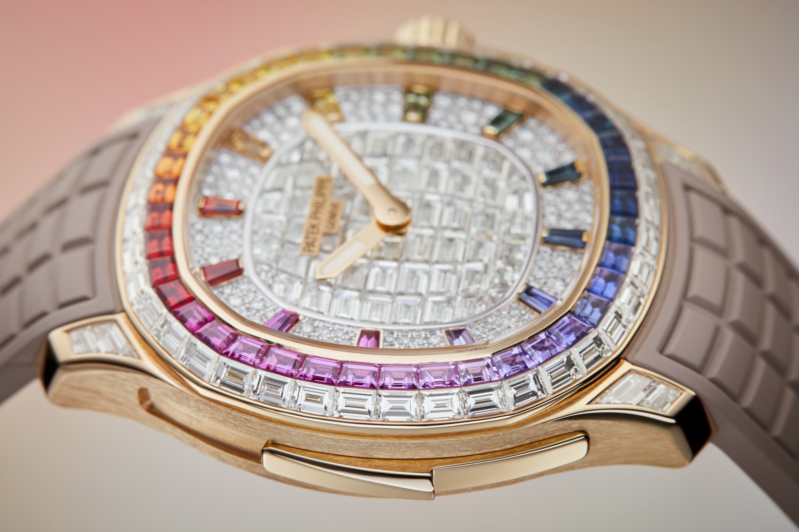 該系列的新款A(yù)quanaut Luce「彩虹」高級(jí)珠寶三問(wèn)腕表整體設(shè)計(jì)兼具時(shí)尚與高級(jí)珠寶元素,適合現(xiàn)代女性佩戴。品牌在表面中央、表環(huán)、表側(cè)及表鏈外側(cè)和中央鏈節(jié)上採(cǎi)用了「隱密式鑲嵌」的精湛工藝,使珍貴的裝飾元素更顯光芒。此款腕表的表面非常清晰易讀,12個(gè)長(zhǎng)方形多色藍(lán)寶石小時(shí)刻度與小時(shí)顯示環(huán)上的長(zhǎng)方形鑽石相搭配。腕表的玫瑰金表鏈配有品牌專利摺疊扣,由四枚獨(dú)立扣爪固定,並鑲有藍(lán)寶石。時(shí)針鑲有三顆長(zhǎng)方形紅寶石,分針則鑲有五顆長(zhǎng)方形藍(lán)寶石,而承載指針的十瓣輪孔口上鑲有一顆圓鑽。