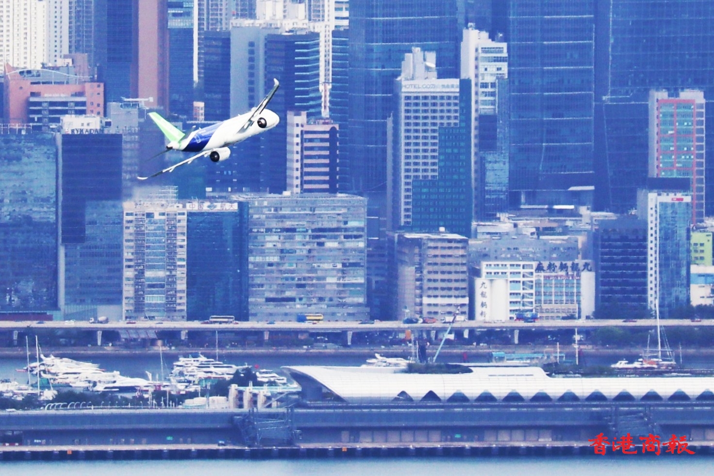 C919大飛機(jī)今早在維多利亞港上空進(jìn)行飛行演示。記者 馮瀚文攝