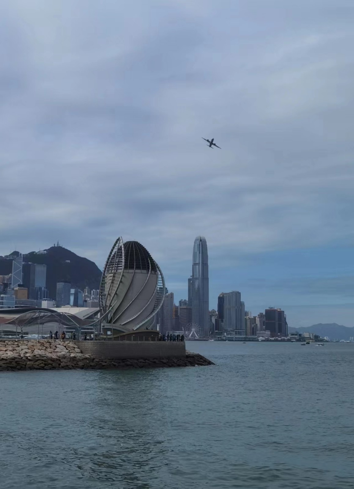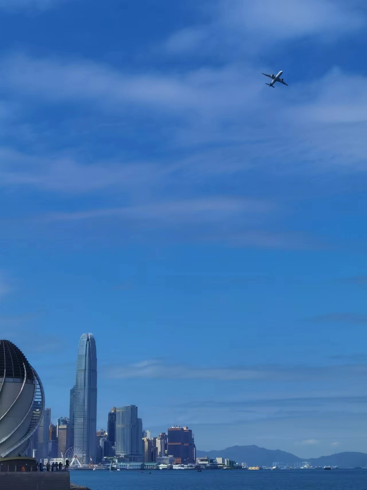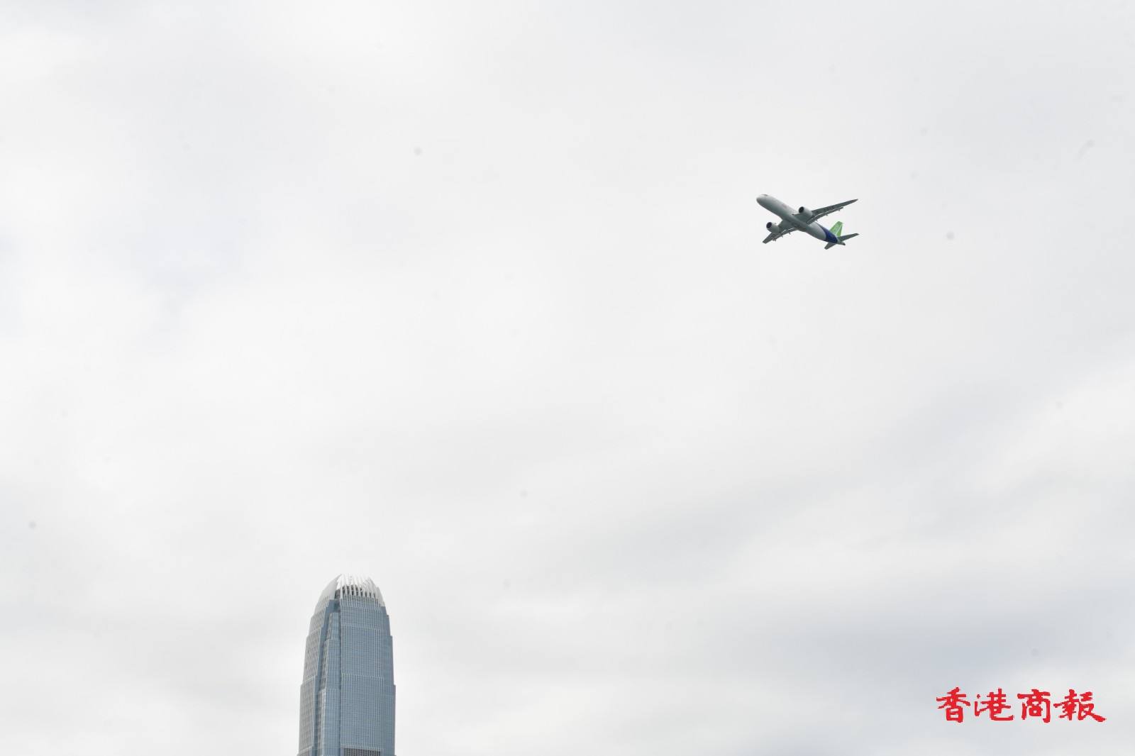 現(xiàn)場所見,本港今天天氣晴朗,有陽光,C919在維港上空翱翔,融入維港景色。