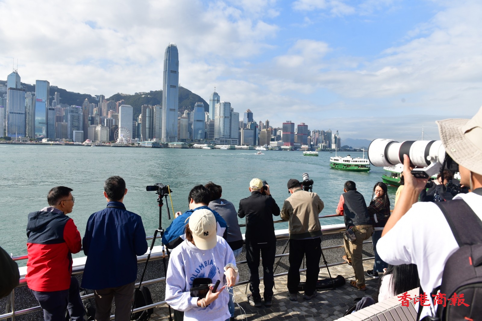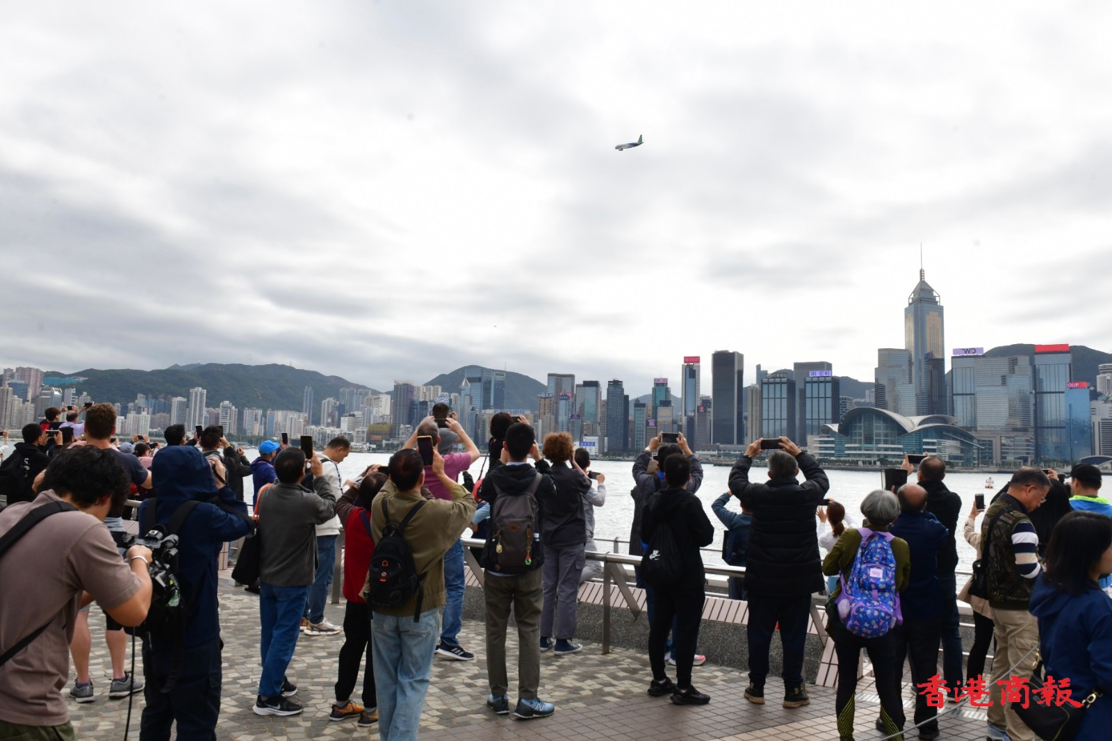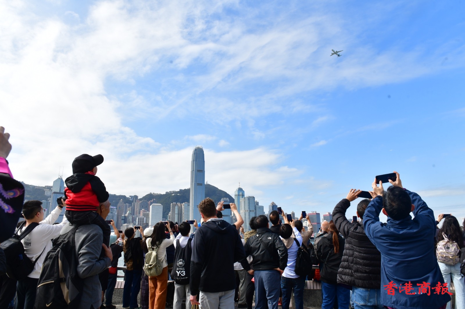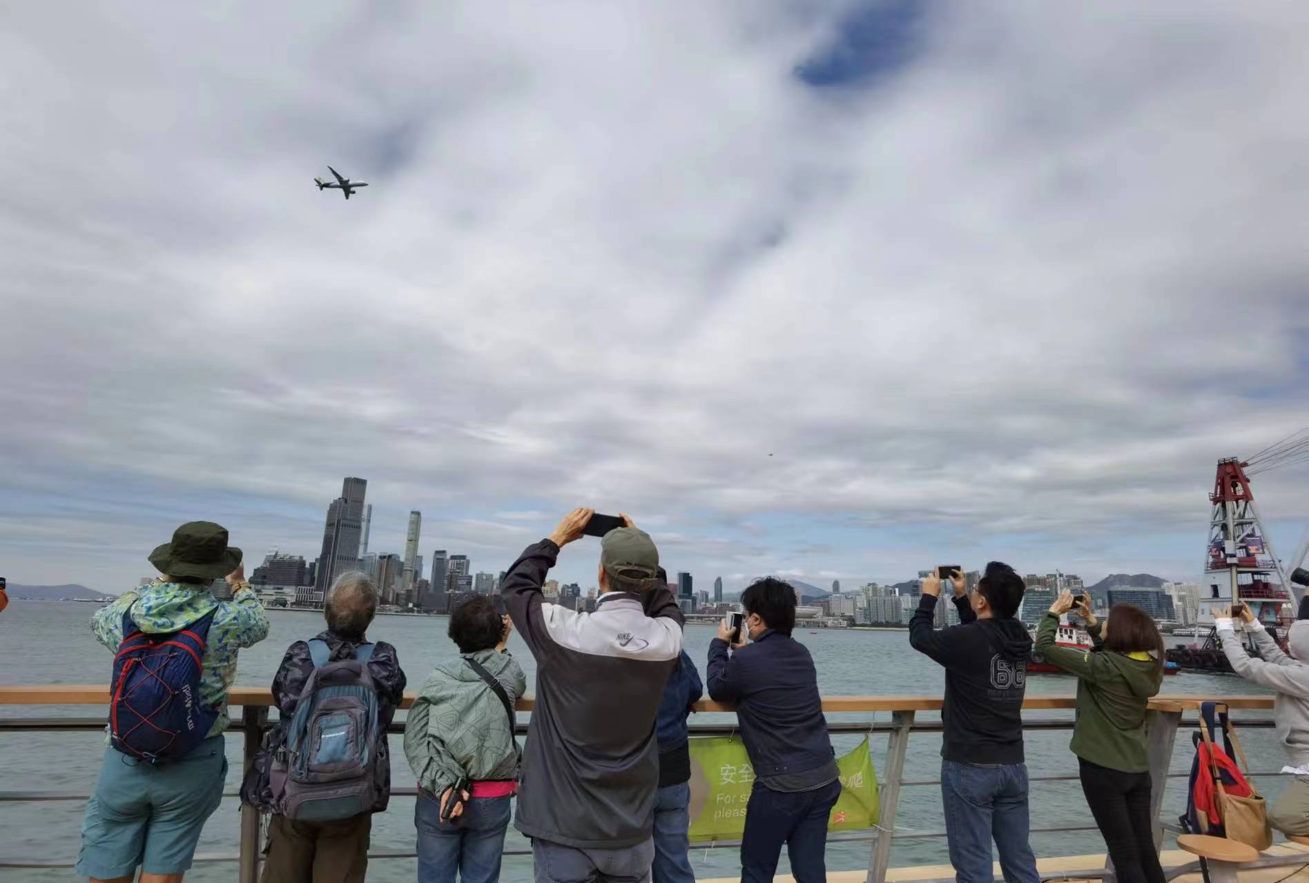 在尖沙咀海旁,有人早上8時左右已到場,大批市民及遊客觀賞C919進(jìn)入維港上空,當(dāng)中更有不少攝影發(fā)燒友及「飛機(jī)迷」,拍攝到C919進(jìn)入維港上空的照片。