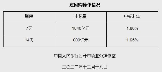 據(jù)央行網(wǎng)站消息,為維護(hù)年末流動(dòng)性合理充裕,2023年12月18日人民銀行以利率招標(biāo)方式開展了2440億元7天期和14天期逆回購操作。具體情況如下: