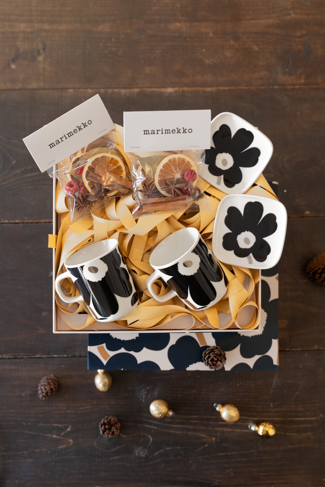 品牌並推出節(jié)日限定禮盒套裝,外包裝是深藍(lán)搭配燙金的UNIKKO印花,內(nèi)有一對(duì)UNIKKO或KUUSIKOSSA印花的馬克杯和碟子套裝,限量附送芬蘭傳統(tǒng)聖誕熱飲Mulled wine spice兩份。