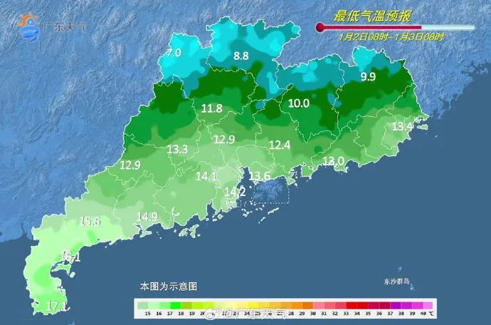 廣東省氣象部門預計,與常年相比1月廣東大部平均氣溫偏高0.1~0.5℃,最低氣溫偏高0.1~0.5℃。氣象部門認為,1月出現(xiàn)全省性寒潮事件的可能性不大;預計1月7日—9日、27日—31日粵北山區(qū)市縣可能出現(xiàn)霜(冰)凍天氣。