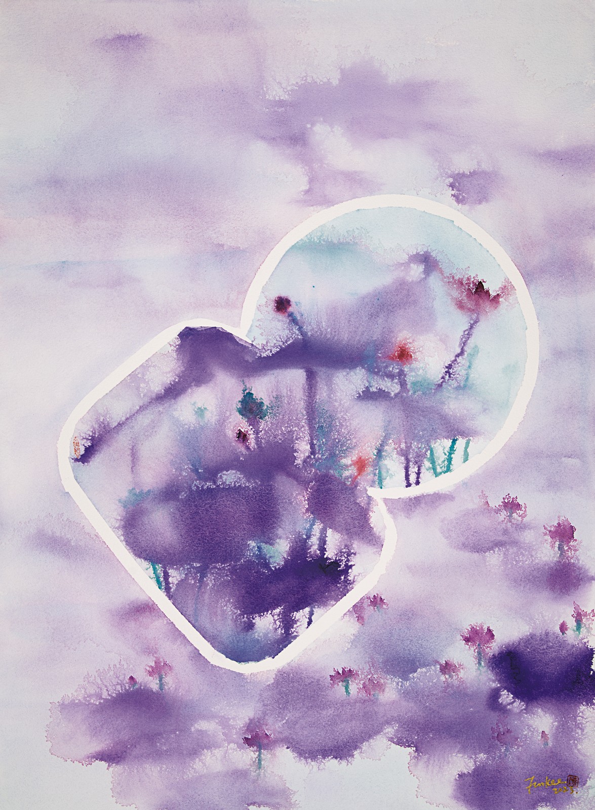 「別有洞天」這個(gè)系列的作品以圖形為主要的表現(xiàn)點(diǎn),將文字的意象轉(zhuǎn)化為可觀的形與色,如《寶葫中懸》的畫(huà)面中以葫蘆的形狀分隔出中心部分,製造出「畫(huà)中有畫(huà)」的效果。儘管畫(huà)面分割成為兩部分,但整幅畫(huà)卻統(tǒng)一在紫色調(diào)中。同時(shí),葫蘆的諧音是「福祿」,也寓意著健康長(zhǎng)壽,與紫色的「紫氣東來(lái)」美好象徵相互呼應(yīng),呈現(xiàn)喜慶吉祥的氣氛。又如《物轉(zhuǎn)星移幾度秋》,畫(huà)面背景以暗淡的色調(diào)描繪出一片蕭索的荷塘景象,而兩顆紅星跳脫出畫(huà)面,表現(xiàn)出深秋的濃郁色彩。五角星的圖形與詩(shī)句中「物轉(zhuǎn)星移」相對(duì)應(yīng),顏色的對(duì)比也凸顯出季節(jié)更替的動(dòng)態(tài)感,趣味十足?!稒M看成嶺側(cè)成峰》這幅畫(huà),自左向右分割成三個(gè)部分:起初為生機(jī)勃勃的碧綠荷塘,逐漸變?yōu)槌脸聊红\下的紫霞,隨後回歸清晨的靜謐,形成時(shí)間上的一種循環(huán);而空間上從不同角度進(jìn)行的荷塘的表現(xiàn),俯仰之間展現(xiàn)出不同時(shí)間下荷塘的色彩變化,正如觀山之「橫看成嶺側(cè)成峰,遠(yuǎn)近高低各不同」。