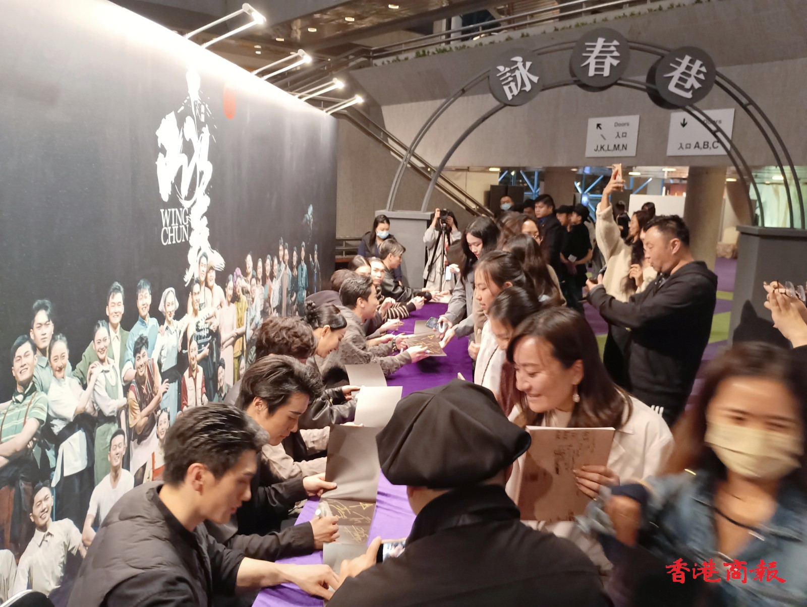 另外,完場後,大批觀眾排隊(duì)索取《詠春》演員簽名;《詠春》中葉問的扮演者常宏基還與萌萌噠的四歲小「葉問」合影。(記者 馮瀚文攝)