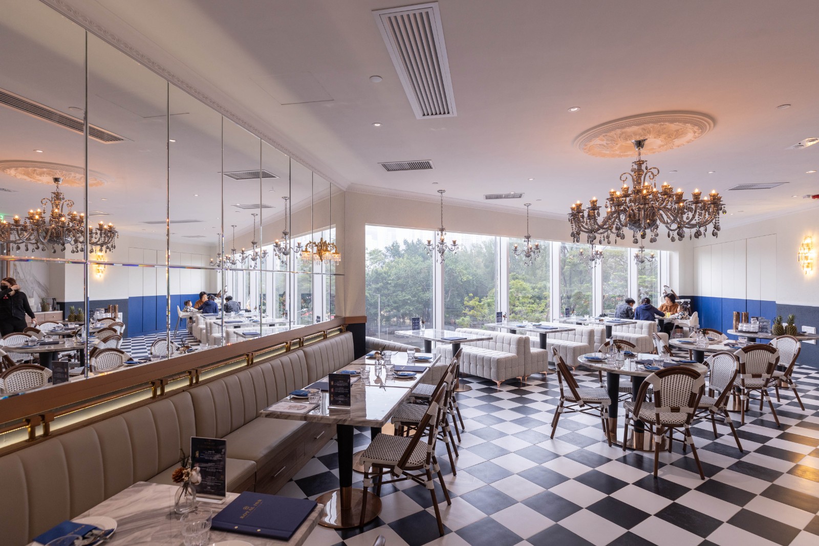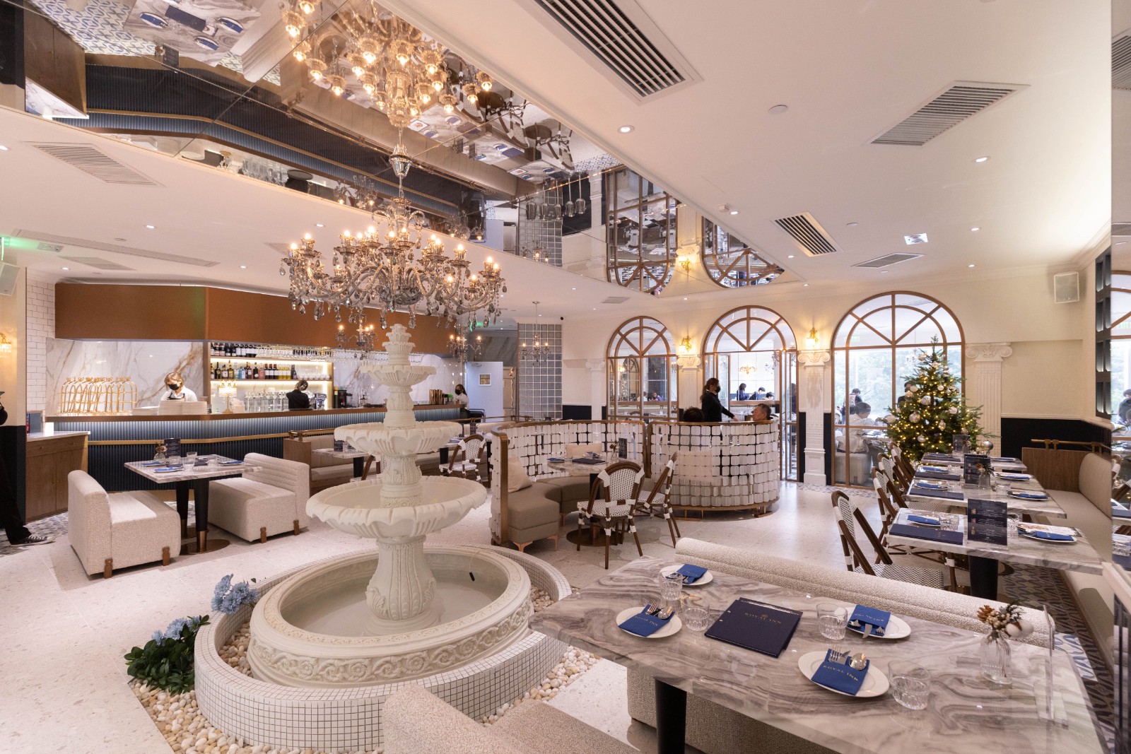 新店裝修風(fēng)格融合藝術(shù)設(shè)計(jì),主色調(diào)是米白和深藍(lán)色,配以黑白地磚,營造出淡雅清新感。大門旁邊能看見許願(yuàn)水池,配以天花鏡面及華麗的水晶吊燈,令人恍如置身於浪漫情調(diào)的巴黎街頭小餐館,每個(gè)角落都能成為打卡位。