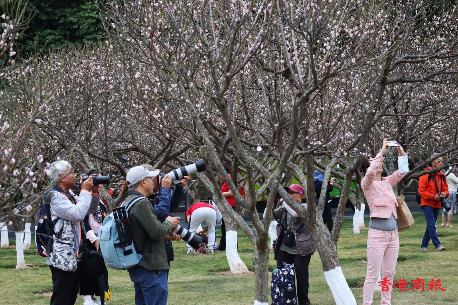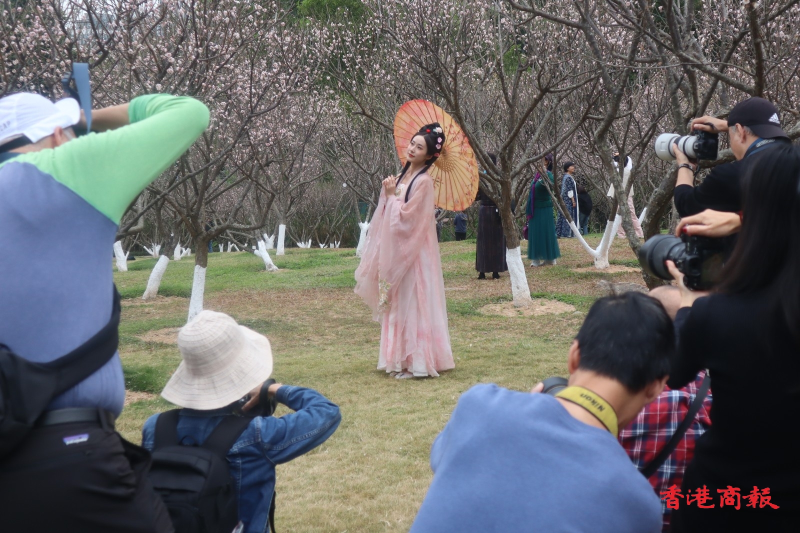 隨著梅花盛開,不少攝影愛好者及愛花之人都不約而同地相聚梅園,他們有的手持輕巧手機(jī),有的帶備重裝的相機(jī)器材,用各自的方式拍下梅花的美態(tài);還有人穿上漢服、旗袍來拍照,為梅園的梅花添上詩意。(記者 馮瀚文攝)