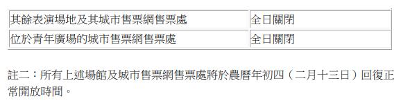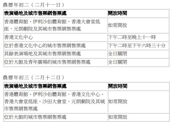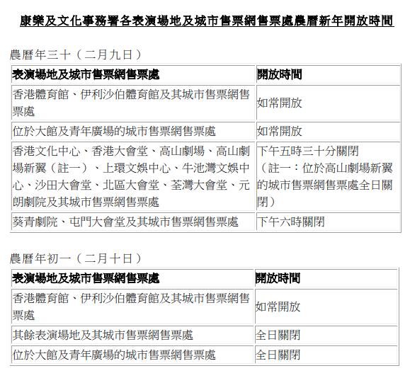 文化設(shè)施方面,康文署轄下各表演場地及城市售票網(wǎng)售票處的開放時間見下圖。在2月9日至13日(農(nóng)曆年三十至年初四)期間,城市售票網(wǎng)網(wǎng)上(www.urbtix.hk)及流動購票應(yīng)用程式URBTIX購票服務(wù)維持正常,而電話購票熱線3166 1288和票務(wù)查詢及客戶服務(wù)熱線3166 1100由上午10時至晚上8時提供正常服務(wù)。