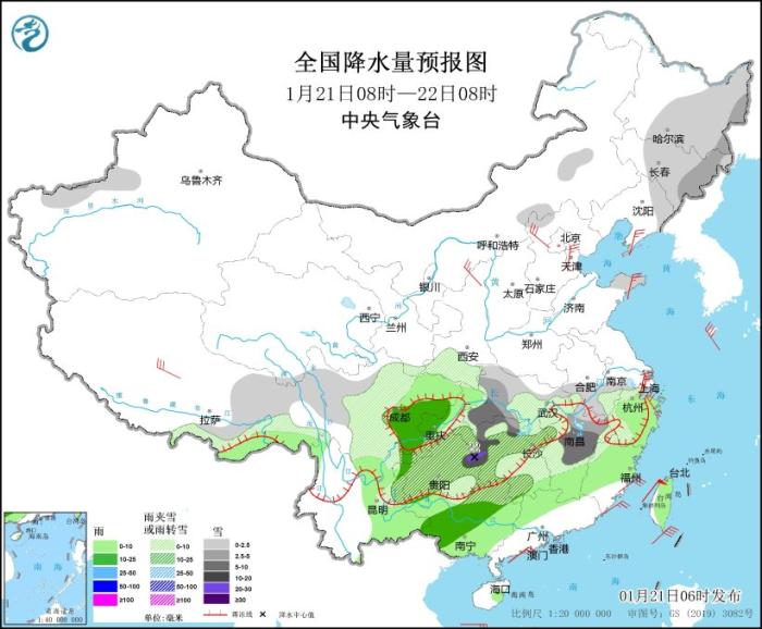 1月21日08時至22日08時,東北地區(qū)中東部、西藏東部、黃淮東部、西南地區(qū)東部、江漢東部和西部、江南大部、華南北部等地的部分地區(qū)有小到中雪或雨夾雪,其中,湖北西南部、湖南中西部和北部、貴州中東部和西南部、重慶東部等地的部分地區(qū)有大到暴雪,局地有大暴雪(20~22毫米)。西藏東南部、江南東部和南部、四川盆地及西南地區(qū)南部、華南南部和西部、臺灣島等地的部分地區(qū)有小到中雨。西藏北部、遼東半島、陝西北部、華北北部、山東半島、浙江東部等地的部分地區(qū)有4~6級風(fēng)。