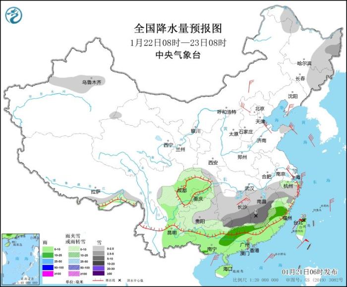 1月22日08時至23日08時,東北地區(qū)東部、新疆沿天山地區(qū)、西藏東南部、黃淮東部、西南地區(qū)東部、江南大部、廣西東北部等地的部分地區(qū)有小到中雪或雨夾雪,其中,湖南南部、江西中南部、廣西東北部等地的部分地區(qū)有大雪(5~9毫米)。四川盆地和西南地區(qū)南部、江南中東部、福建大部、華南大部、臺灣島等地的部分地區(qū)有小到中雨,局地有大雨(25~30毫米)。內(nèi)蒙古中部、遼東半島、河北北部、山東半島、江蘇東部、浙江東部等地的部分地區(qū)有4~6級風(fēng)。