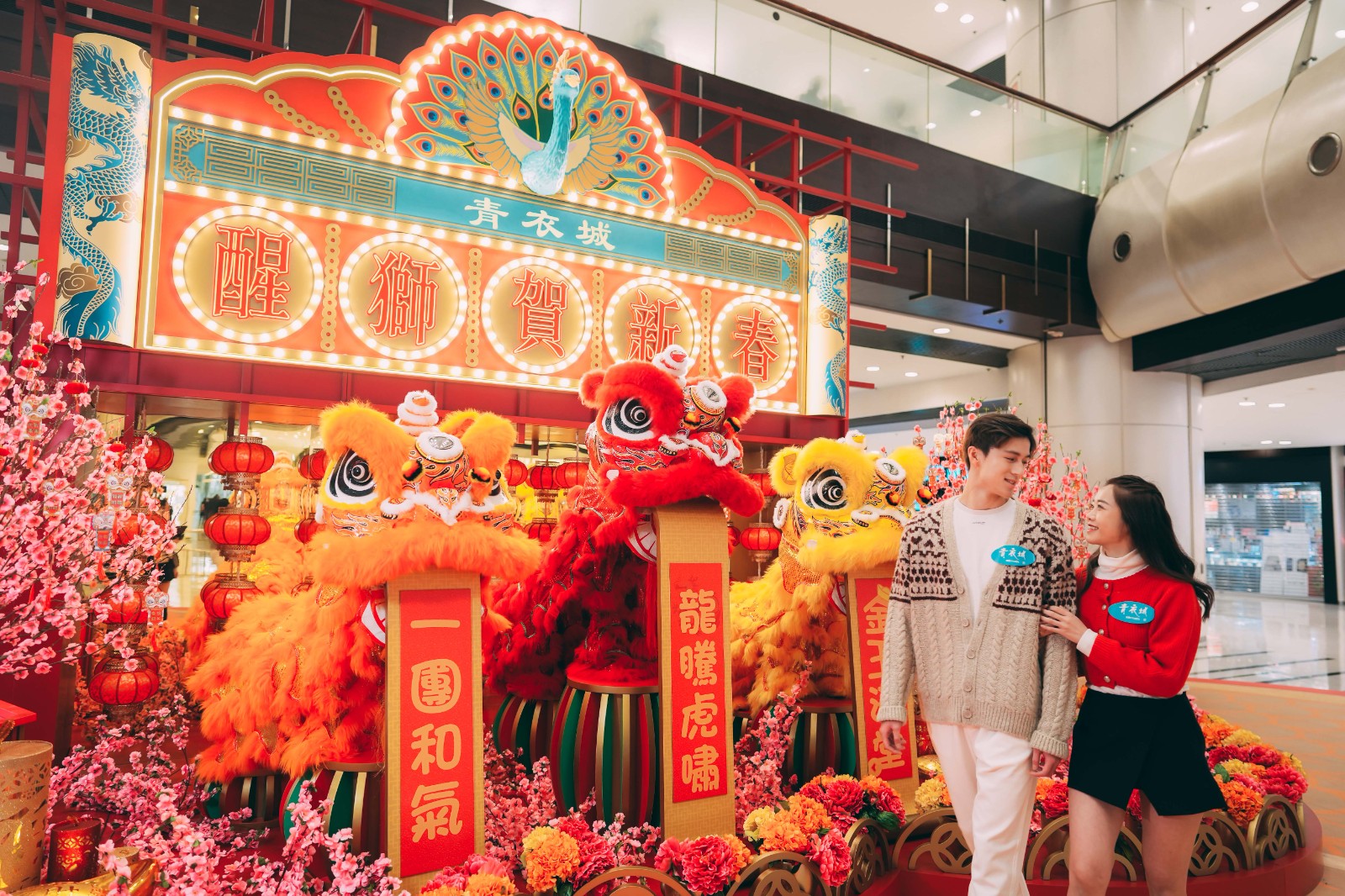 德福廣場(chǎng)及青衣城以中式傳統(tǒng)節(jié)慶文化為主題,前者與「大中華非物質(zhì)文化遺產(chǎn)傳藝會(huì)」打造「福運(yùn)過(guò)龍年」布置,非遺傳承人甘狄英師傅與徒弟張晉瑄製作14米長(zhǎng)、氣勢(shì)逼人的瑞龍?jiān)煨脱b置,於商場(chǎng)中庭展出,場(chǎng)內(nèi)亦設(shè)仿照傳統(tǒng)霓虹燈的打卡燈牌,包括「要乜有乜」、「升職加人工」及「靚到爆鏡」等新式祝福,透過(guò)嶄新的形式展現(xiàn)傳統(tǒng);後者以「醒獅迎福」為主題,於4.8米高的傳統(tǒng)戲棚背景下設(shè)置6隻不同顏色的醒獅,代表健康、財(cái)運(yùn)、家庭、事業(yè)、學(xué)業(yè)及愛(ài)情,亦寓意六六大順,新年期間,國(guó)際龍形王國(guó)祥國(guó)術(shù)總會(huì)會(huì)為小朋友帶來(lái)舞獅訓(xùn)練課程及醒獅巡遊表演。